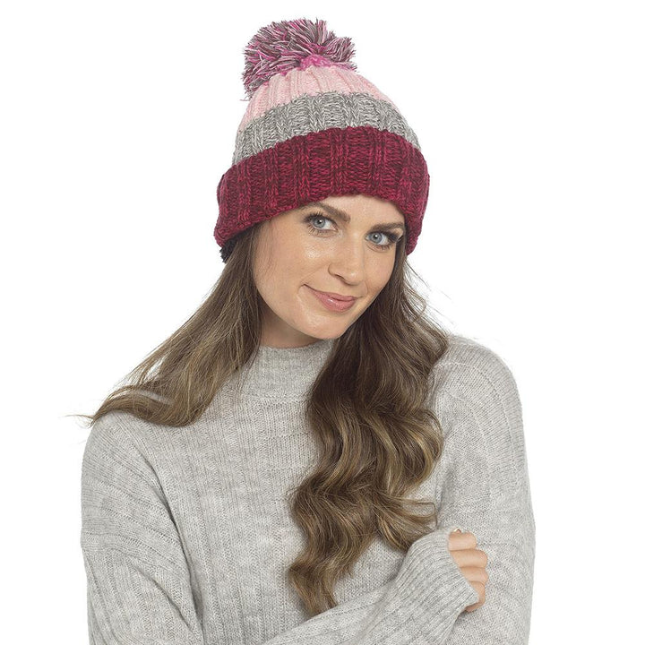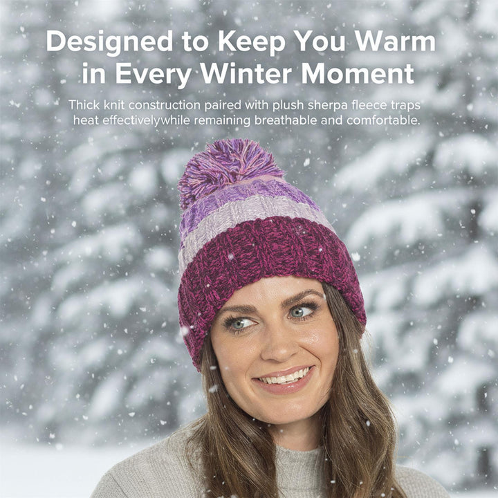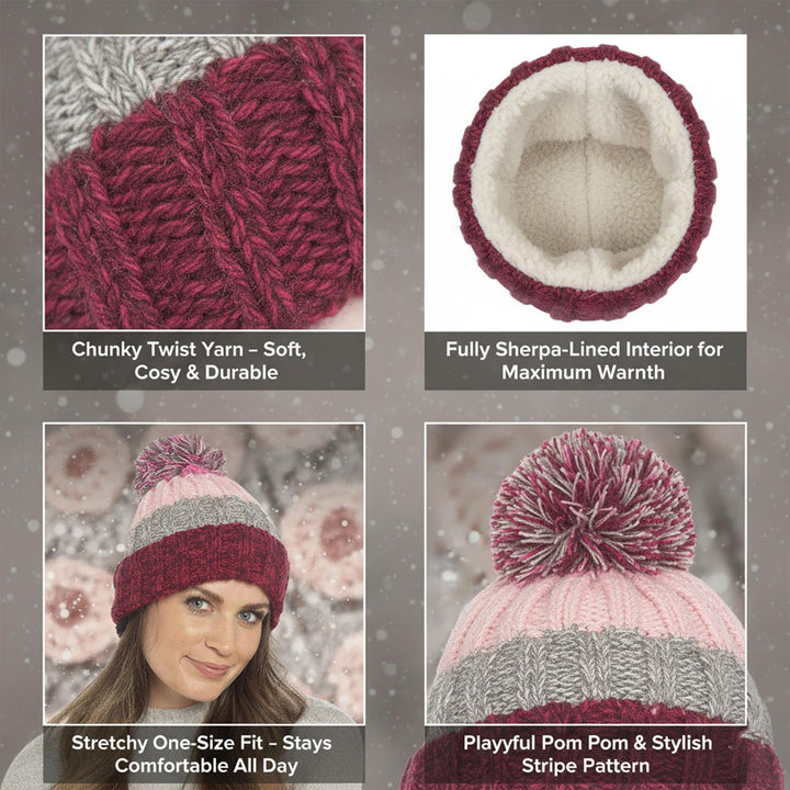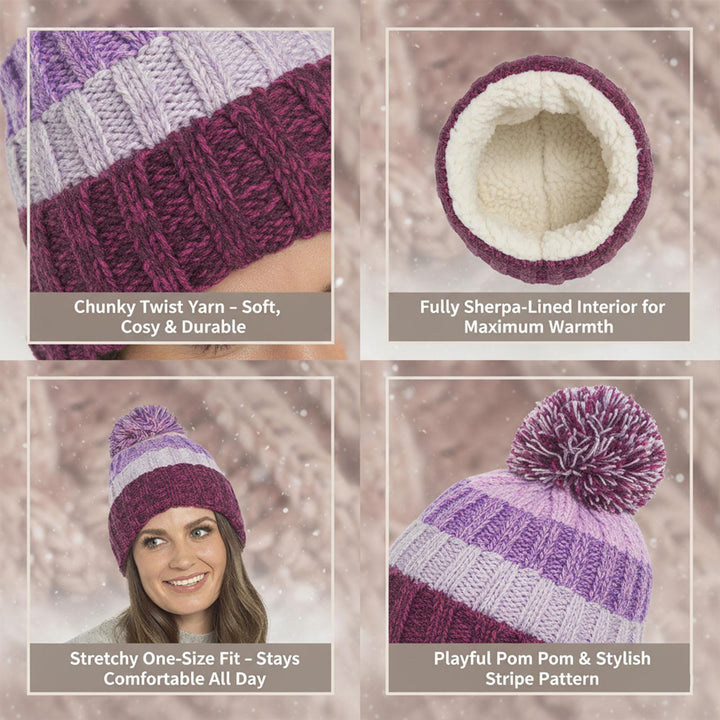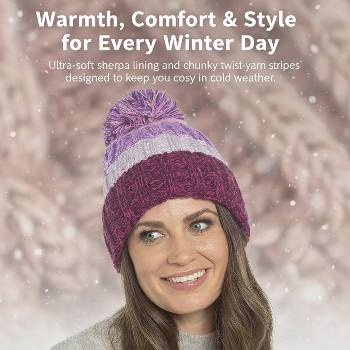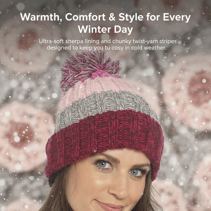 A2Z Womens Twist Yarn Stripe Beanie With Pom Pom And Sherpa Fleece Lining