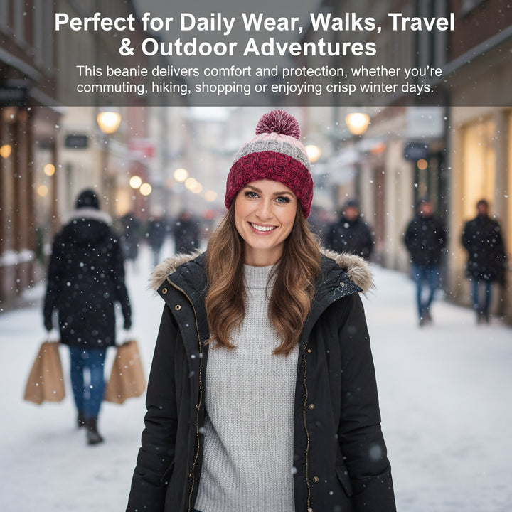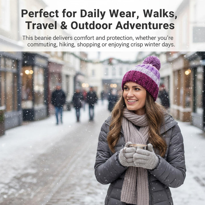 Crafted in a modern twist-yarn stripe pattern with a playful matching pom pom, this beanie adds a stylish finish to everyday winter outfits. Ideal for school runs, festive markets, chilly commutes and holiday getaways, it blends cosy functionality with a flattering shape that suits casual, outdoor and city-wear looks.
