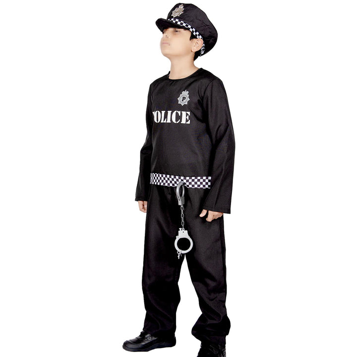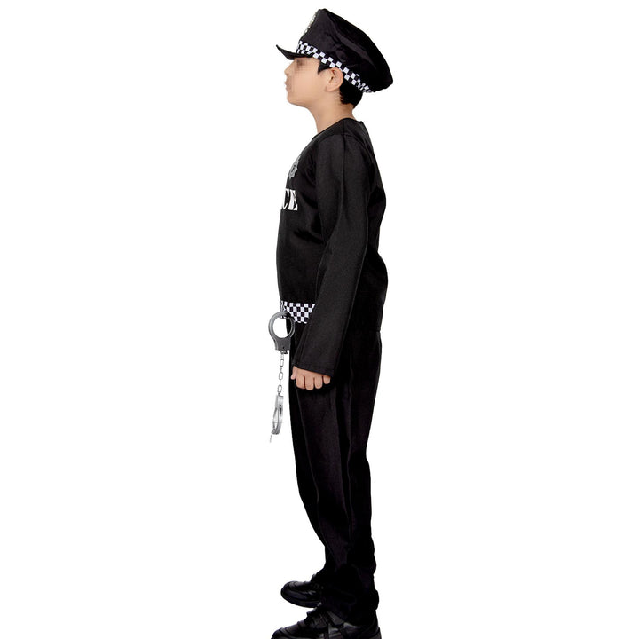 Our Police uniform is a must-have for kids who love to protect and serve. Let them take charge, patrol the streets, and inspire endless adventures in their hero world. This police costume is easy to wear, breathable, and built for comfort. It includes essential accessories like a police hat and handcuffs. The costume features a stylish check pattern stripe on the top and black trousers made from very soft material, ensuring all-day comfort for your little heroes.