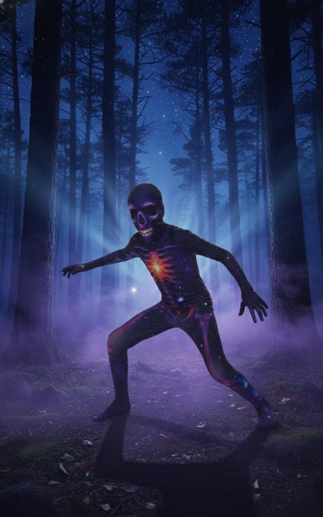 Available in sizes 3–5, 6–8, 9–11, and 12–14 years, this glowing cosmic skeleton costume makes a fantastic gift for Halloween or themed parties. Perfect for fancy dress events, school discos, or photoshoots — a show-stopping outfit that sparks imagination and spooky fun!