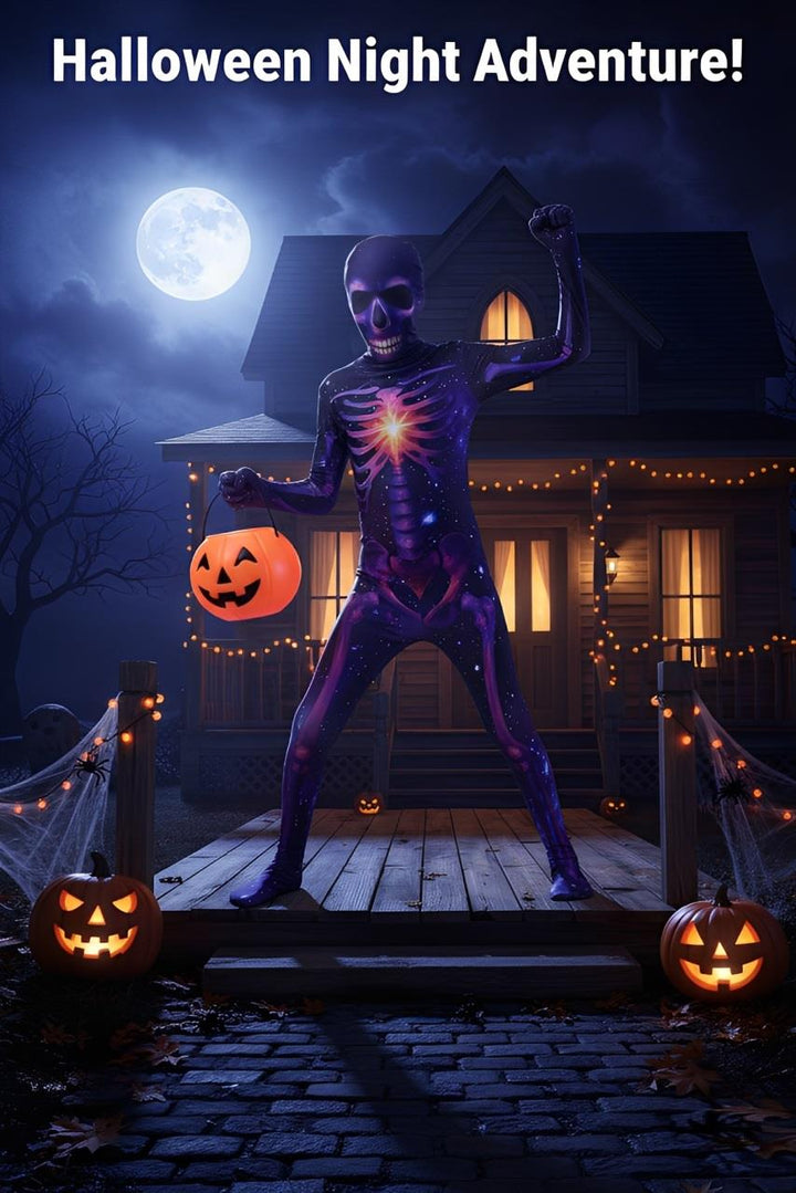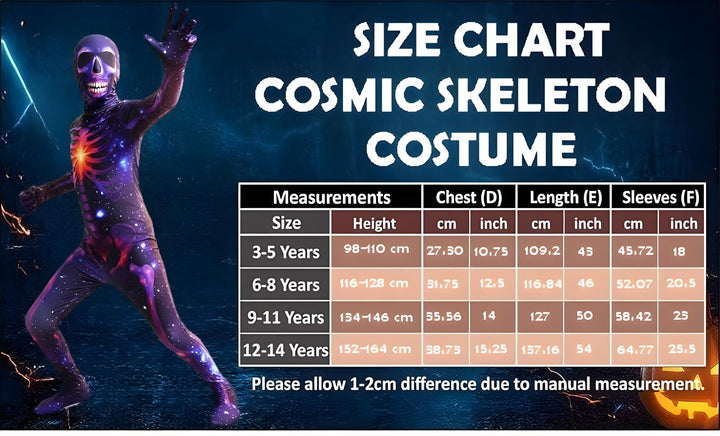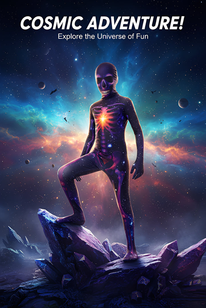 Step into the stars with this cosmic skeleton costume featuring a vivid galaxy print and glowing ribcage effect. Perfect for Halloween parties, fancy dress events, or themed school days, this striking outfit will make your child stand out in any spooky crowd.