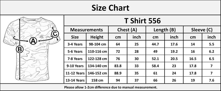 These Camouflage short sleeves t-shirts are available in Charcoal, Blue and Green colour. Available size: 3-4 years, 5-6 years, 7-8 years, 9-10 years, 11-12 years and 13-14 years. -