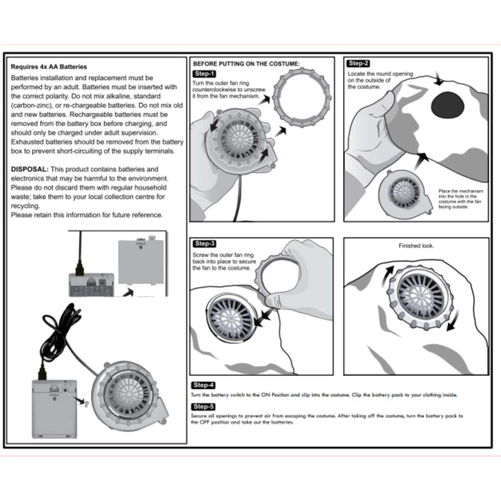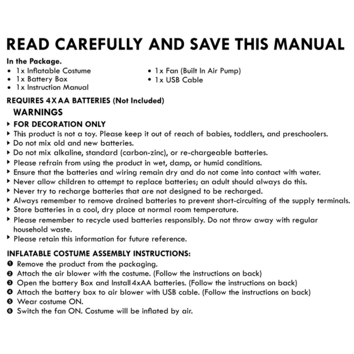 Quick inflation in under a minute with the high-powered fan and battery box. The costume runs up to 4 hours on quality batteries or can be powered via USB cable. Includes costume, fan, battery box (batteries not included), USB cable and instruction manual for stress-free setup. -