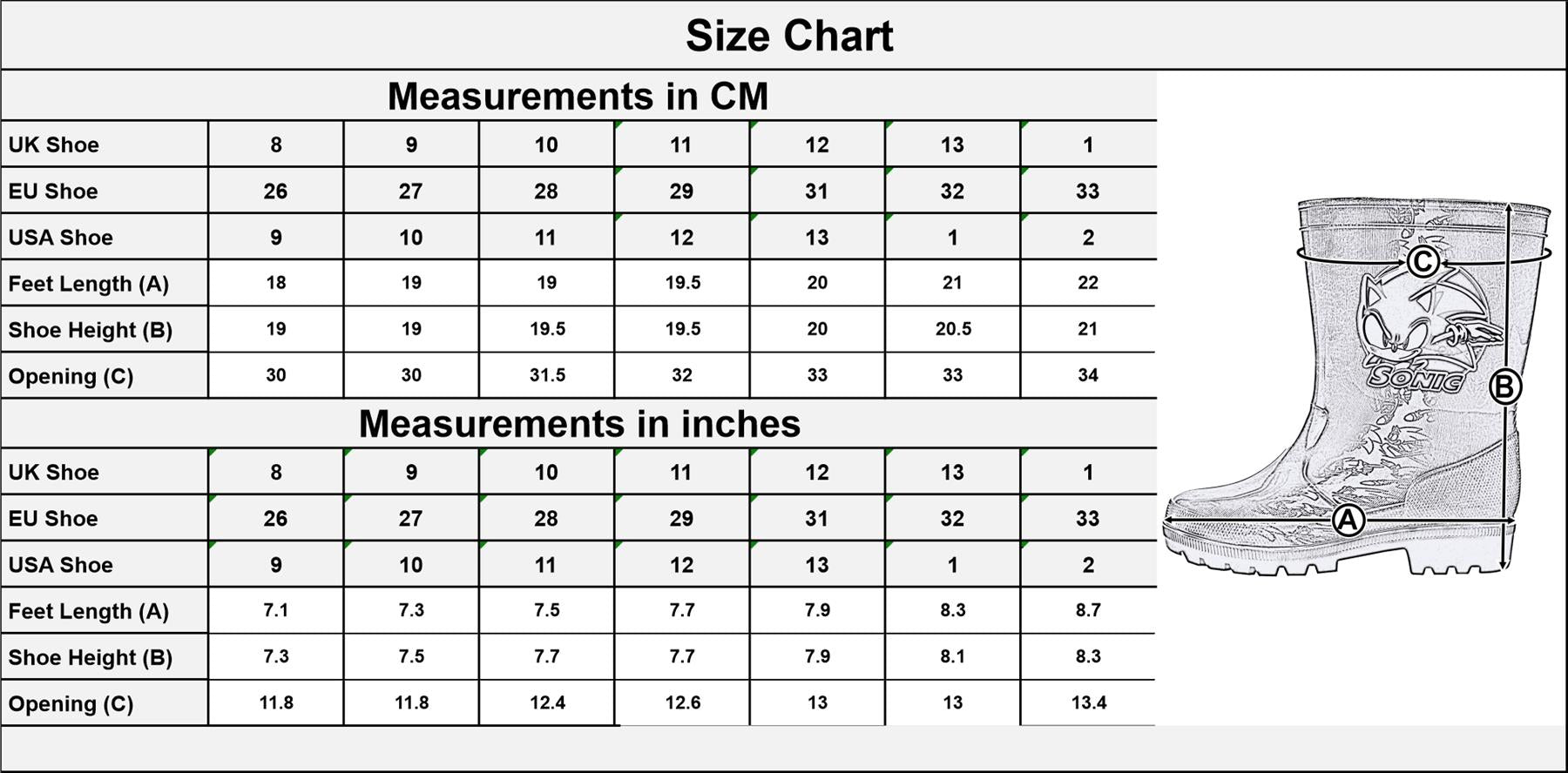 Explore the world of Sonic with our vibrant Wellington Boots! Perfect for young adventurers, these boots feature playful Sonic designs, adding fun to rainy days or outdoor play. Durable, waterproof construction keeps your childs feet dry and cozy in any weather. Let your little Sonic trainer embark on exciting journeys with confidence and style!