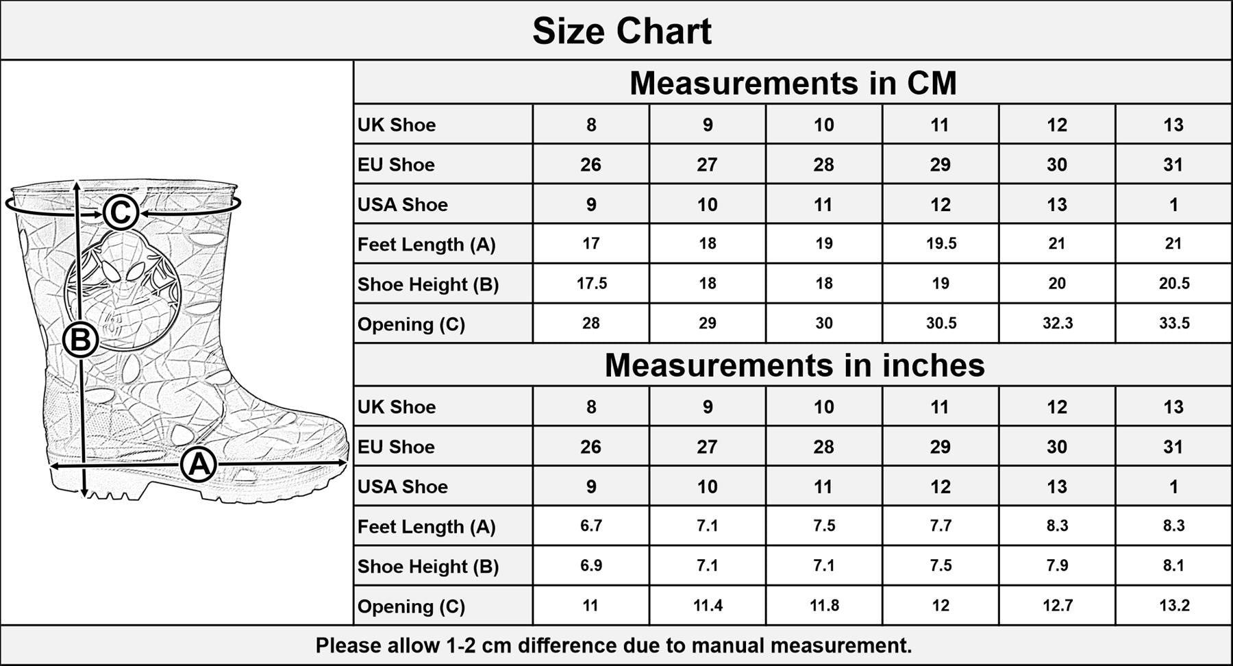 Explore the world of Spiderman with our vibrant Wellington Boots! Perfect for young adventurers, these boots feature playful Spiderman designs, adding fun to rainy days or outdoor play. Durable, waterproof construction keeps your childs feet dry and cozy in any weather. Let your little Spiderman trainer embark on exciting journeys with confidence and style!