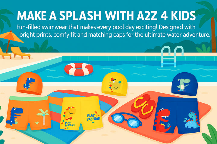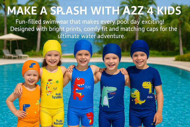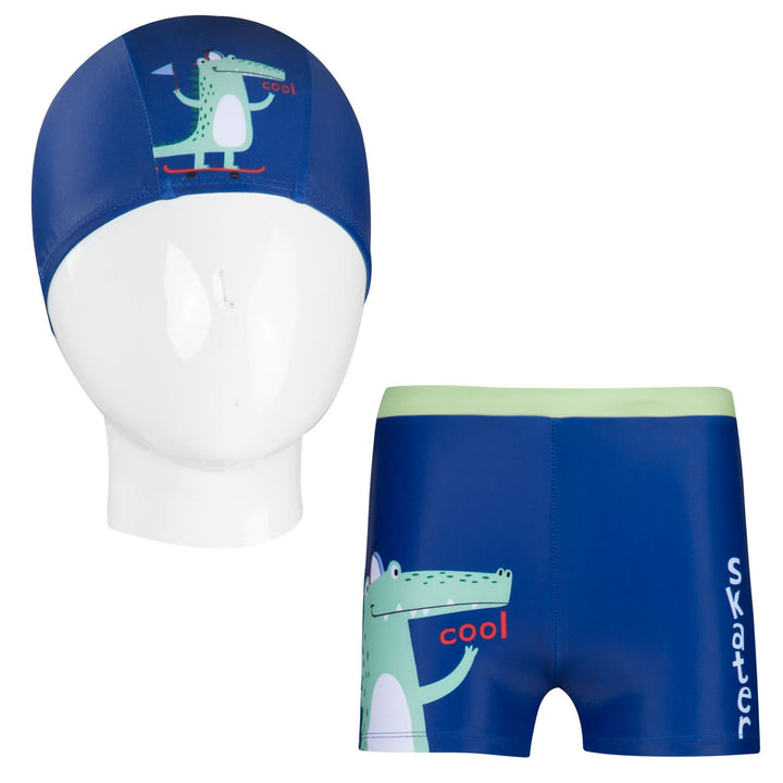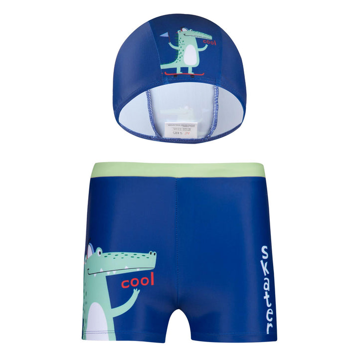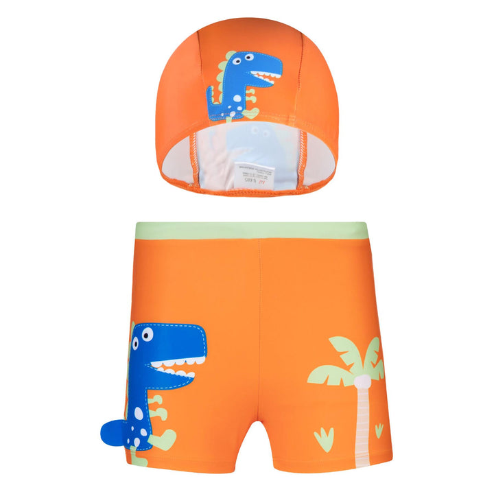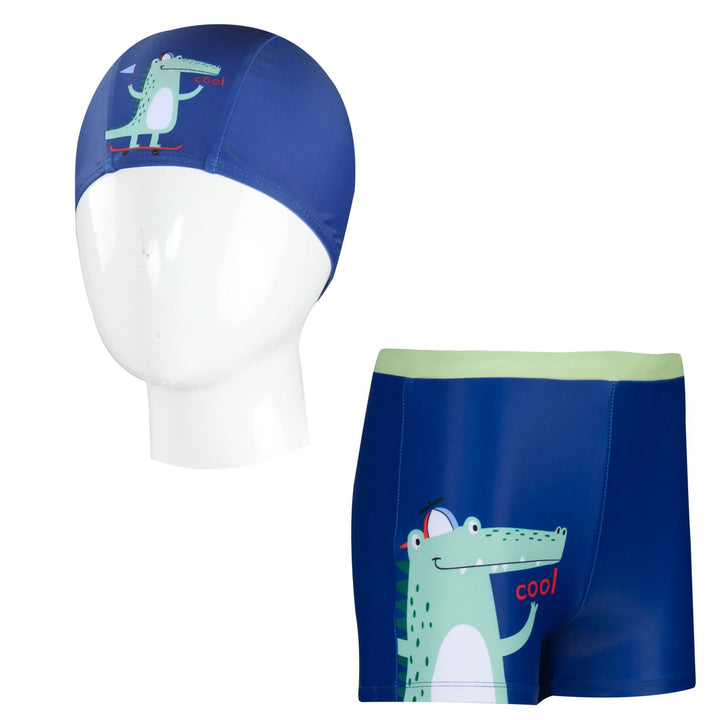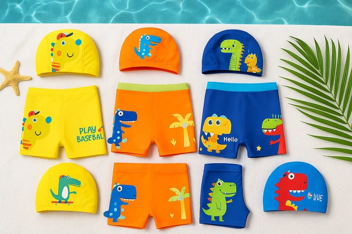Each set features vivid, playful cartoon characters from dinosaurs to crocodiles designed to make swimming fun and appealing. Bright colours and whimsical prints ensure your child stands out and enjoys every splash. Each design is paired with a matching swim cap for a complete look.