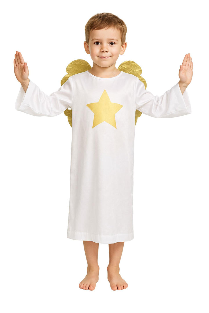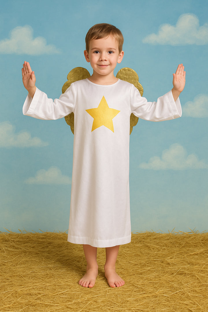 GOLDEN GLORY WITH A TOUCH OF SPARKLE: Our Boys Xmas Nativity Play Angel Outfit comes in a classic and elegant white, reminiscent of heavenly serenity. What truly sets it apart is the glittering star adorning the front, adding a touch of celestial glamour to the ensemble. This Outfit brings the divine to life with a touch of sparkle.