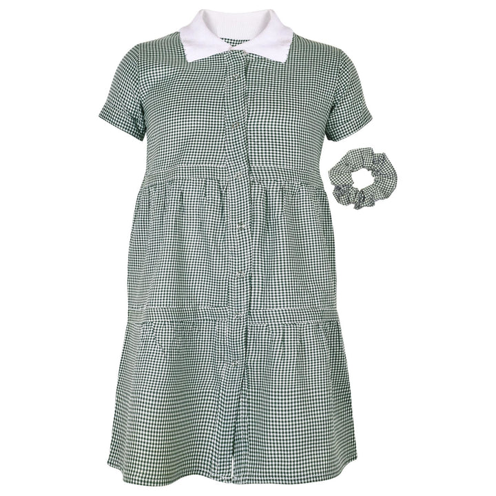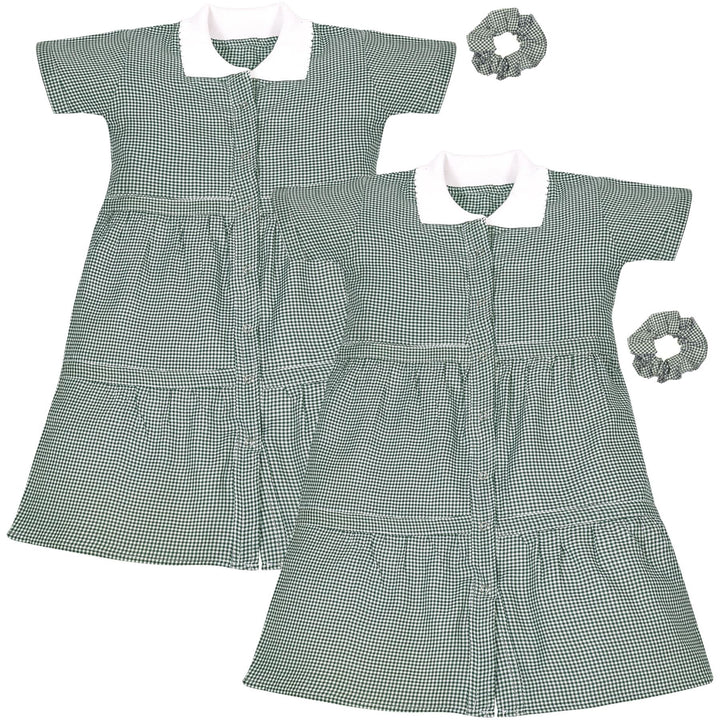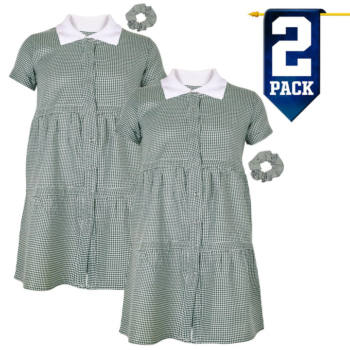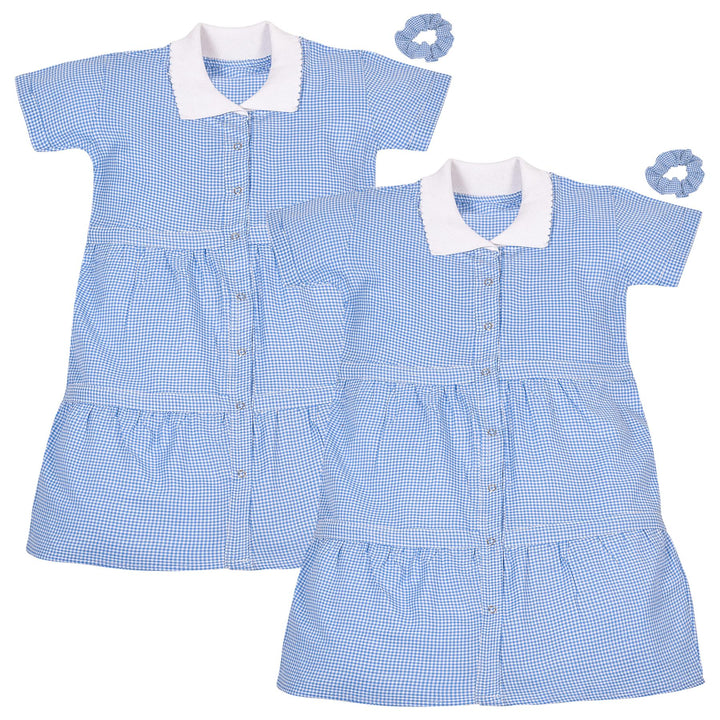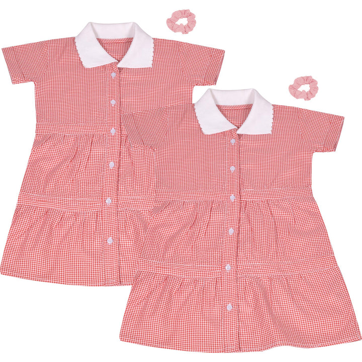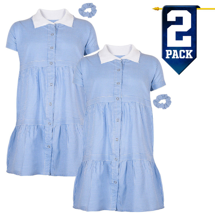 Kids Girls 2 Pack Gingham School Dress Check Button Up Tiered Dresses With Scrunchies