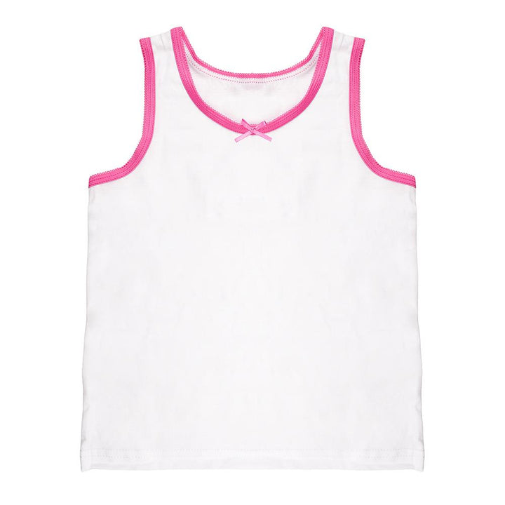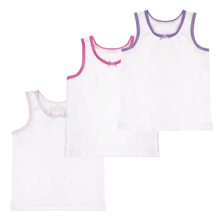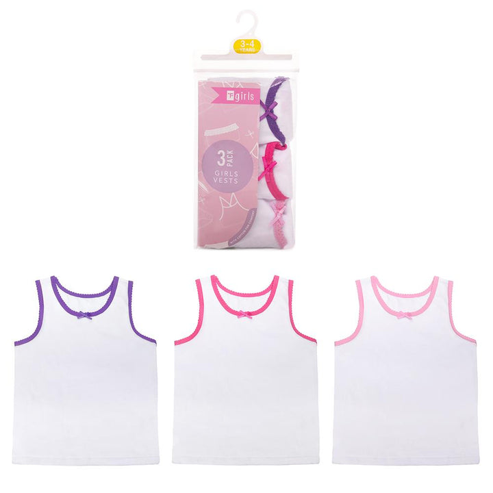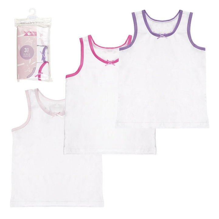 Each pack includes three white vests featuring coloured trim and a cute bow detail, adding a simple yet stylish touch. Available in multiple trim colours and sizes from 2–3 to 7–8 years, they make a practical and thoughtful gift for everyday essentials, school underwear sets or seasonal stocking fillers.