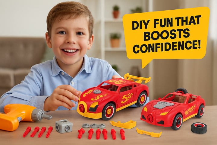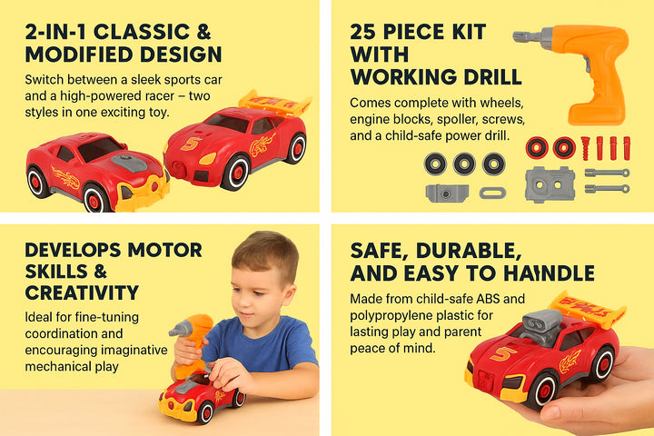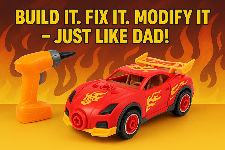 Encourage hands-on learning with this 2-in-1 buildable car kit. Kids can choose between a classic sports car or a modified racer, using real working tools to assemble and reassemble the vehicle with ease.