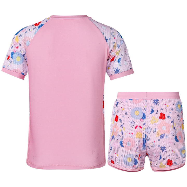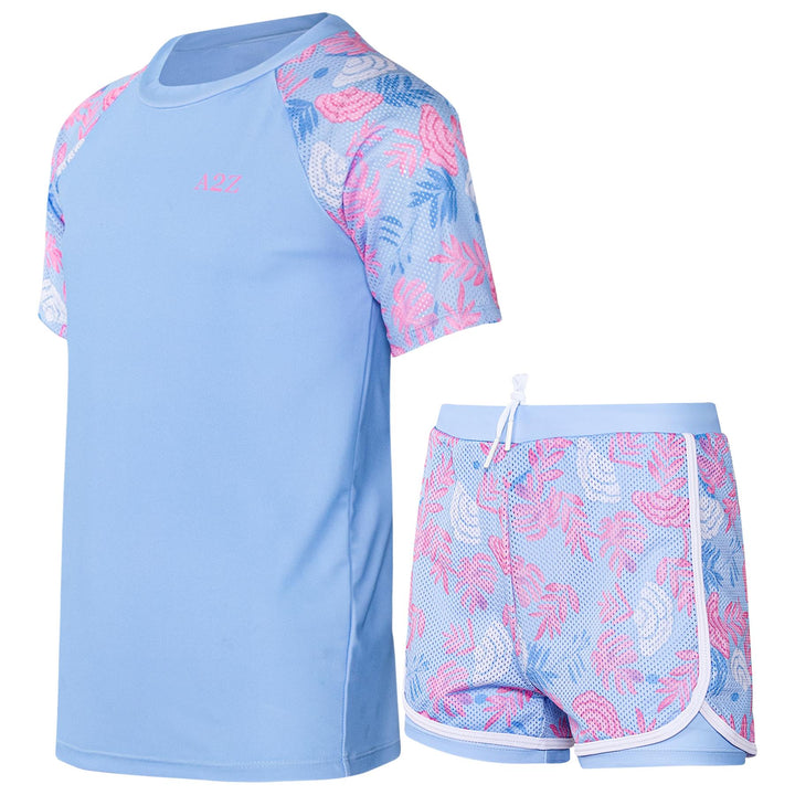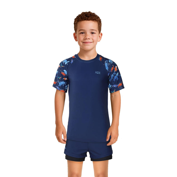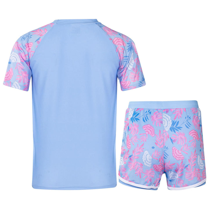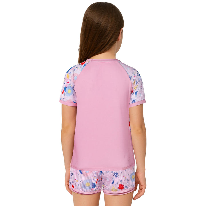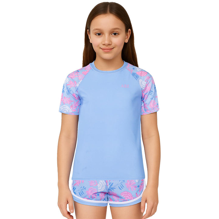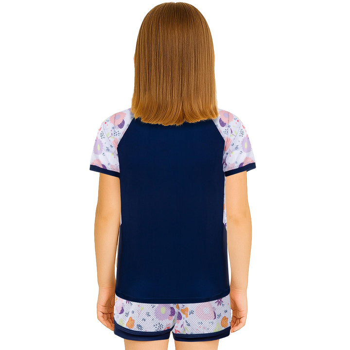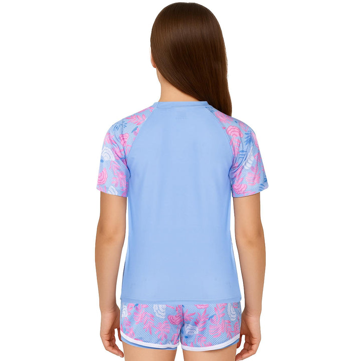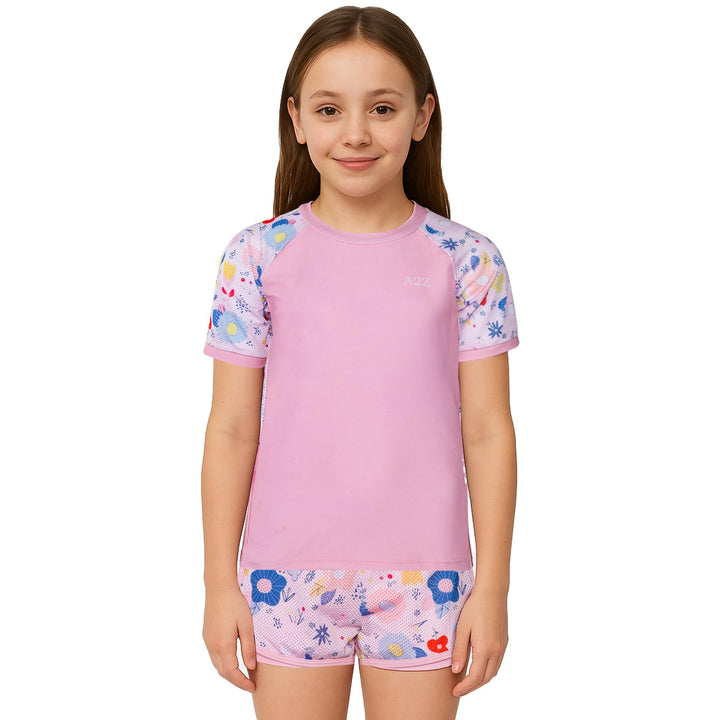 The short-sleeved rash guard top offers UV protection and a snug yet flexible fit. Paired with coordinating shorts, this stylish set shields their skin while letting them shine ideal for holidays, resorts, or splash parks.