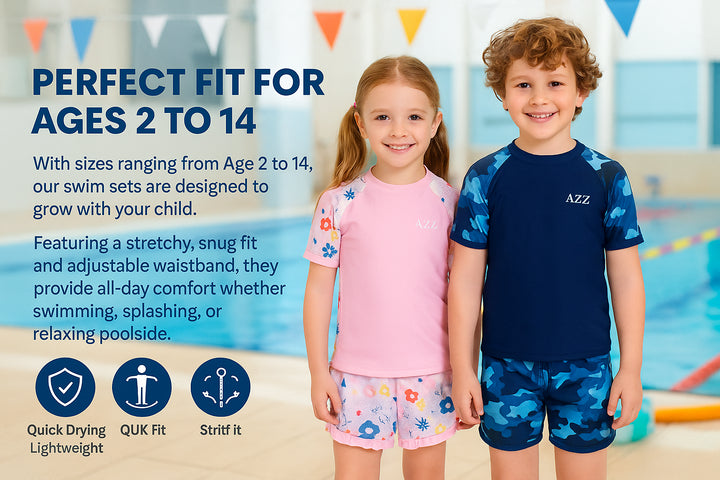 Designed for growing kids with a flexible waistband and functional drawstring, this swimsuit set fits securely from toddlers to teens. Choose from sizes Age 2/3 to 13/14 for the perfect fit at every stage of childhood.