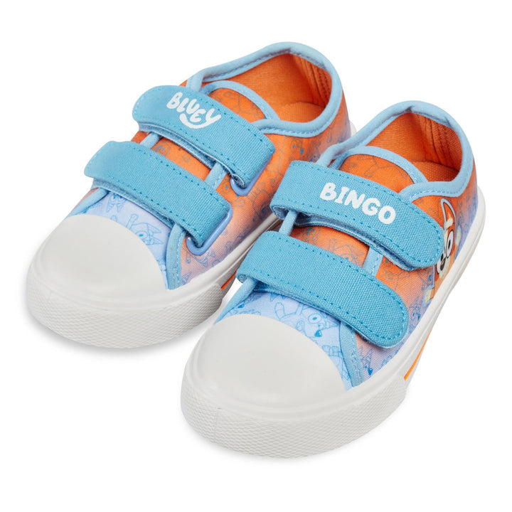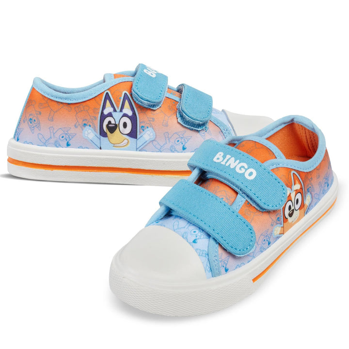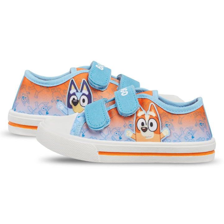 The sneakers showcase a vibrant blue and orange gradient, with Bluey on one shoe and Bingo on the other. The sides feature fun, detailed character prints and playful doodles, making these shoes extra special for little adventurers.