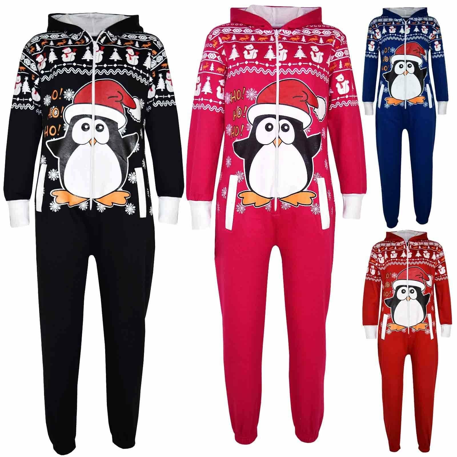 Kids Girls Boys Novelty Christmas Penguin Print Fleece Onesie All in One Jumpsuit Attire Age 5-13 Years