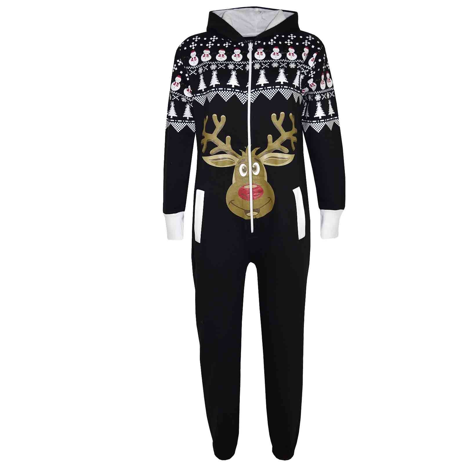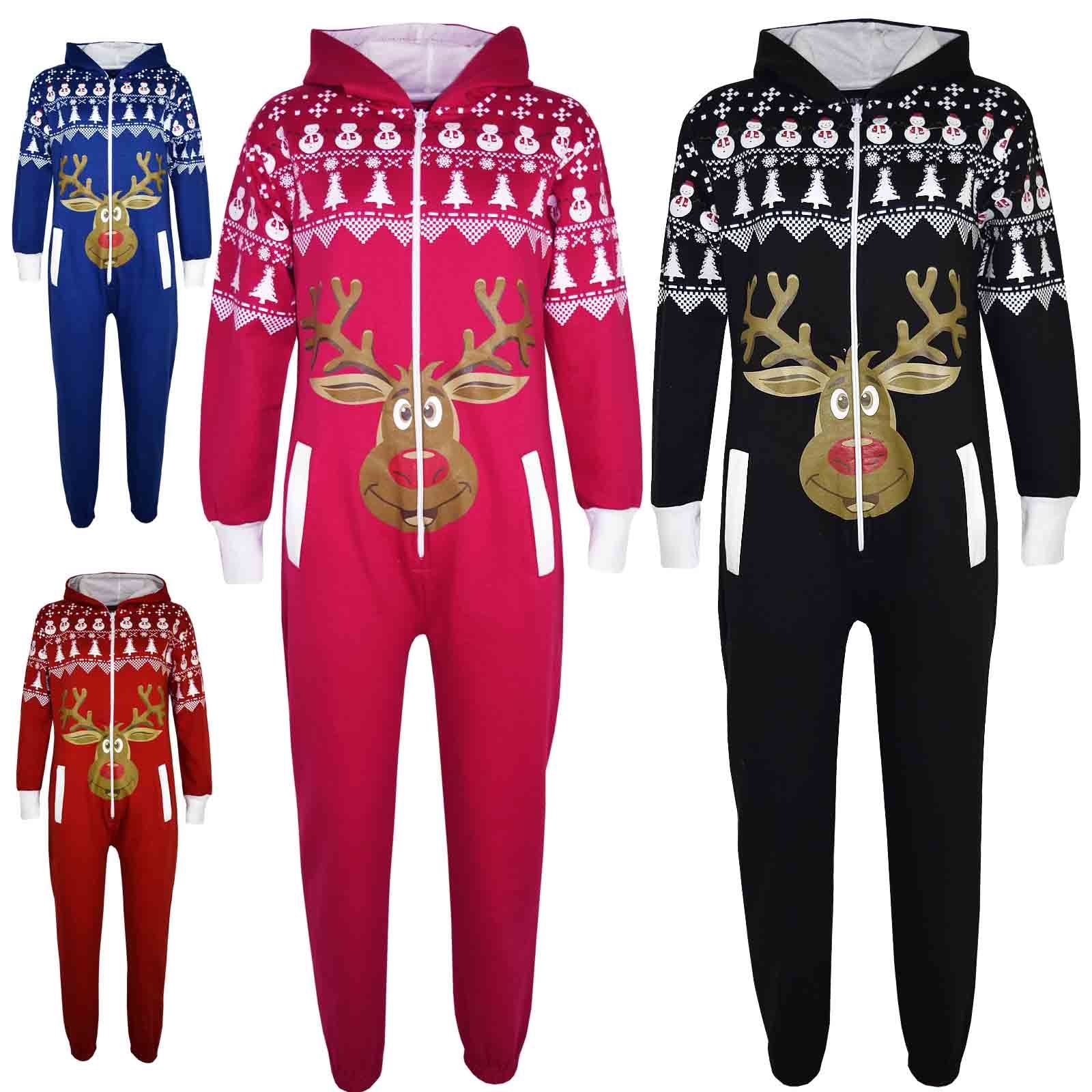 Kids Girls Boys Novelty Christmas Reindeer Print Fleece Onesie All In One Jumpsuit Attire Age 5-13 Years