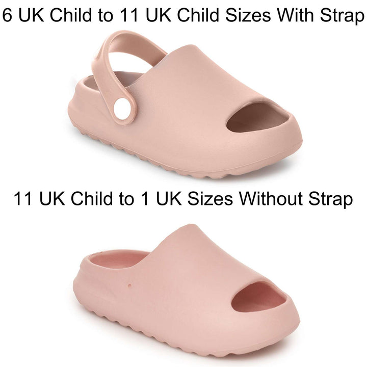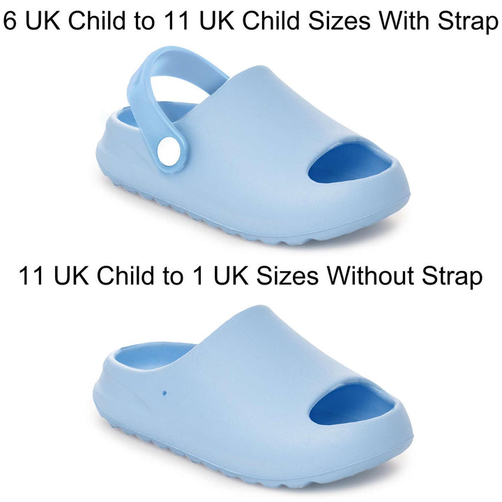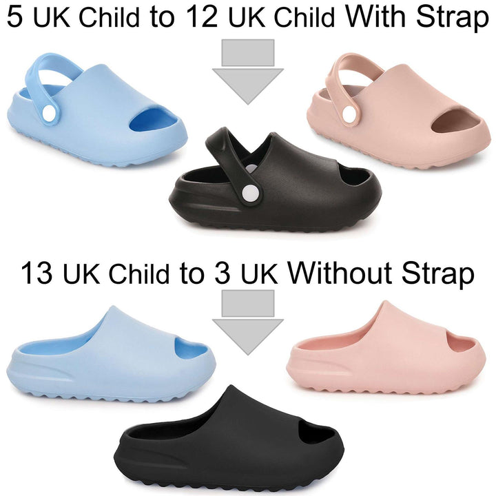 These kids girls and boys pool sliders are available in Black, Blue, Fushia Pink and Royal Blue available in sizes ranging from UK Size 6/7, 8/9, 10/11, WITH STRAP - 11/12, 13/1 WITHOUT STRAP. Their stylish design and versatility make them a popular choice among water enthusiasts of all ages.