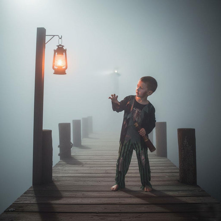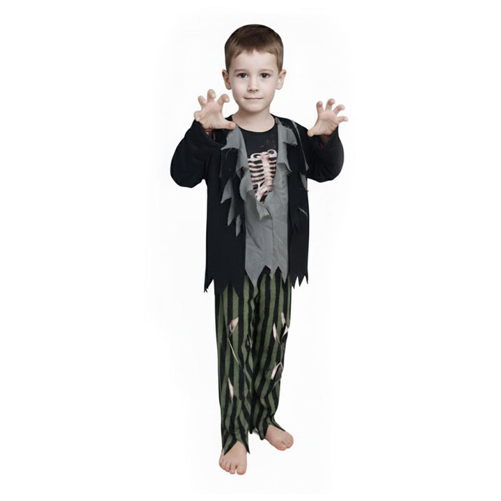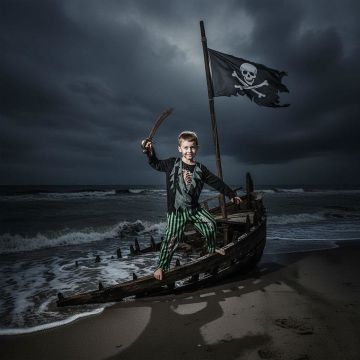 Includes a long sleeved zombie pirate top and striped trousers with bone print detailing for an instant Halloween transformation. Easy to put on and take off, making dressing up fun and hassle-free for both kids and parents. -