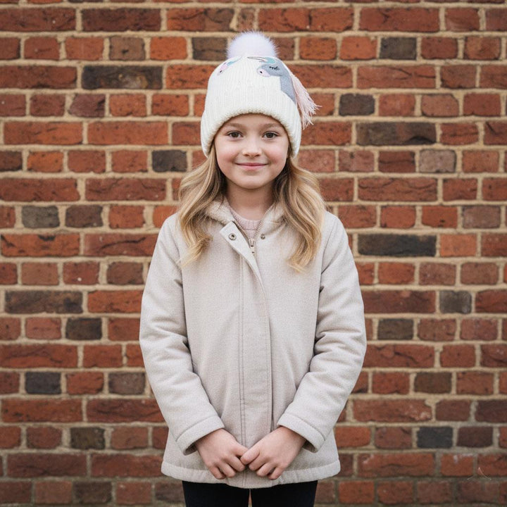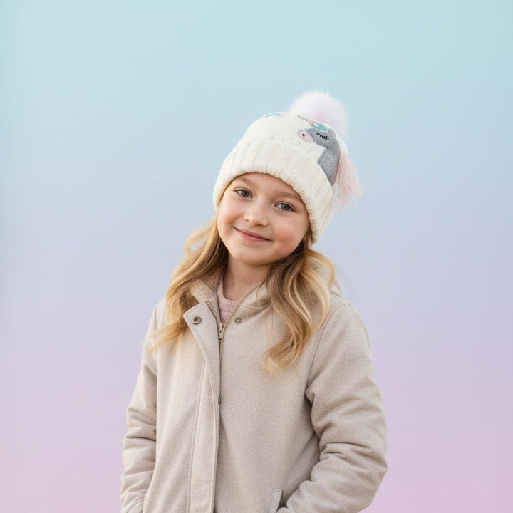 Kids Girls Cable Knit Hat Unicorn Embroided Bobble Baenie Pom Pom Soft Cosy Hat