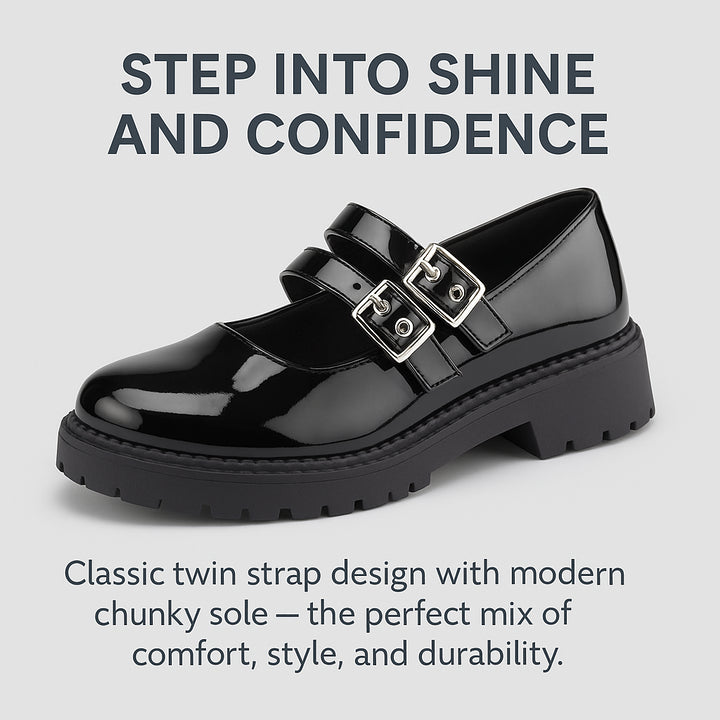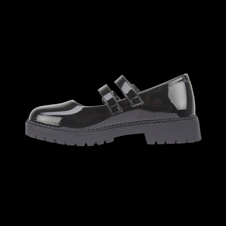 Featuring a timeless Mary Jane silhouette with double buckle straps, these stylish school shoes for girls combine elegance and practicality. The shiny black patent finish adds a modern touch, ideal for school, parties or special occasions, while the secure closure ensures a snug fit all day long.