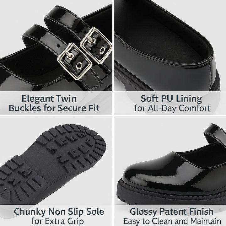 Kids Girls Chunky Mary Jane Black Patent School Shoes Twin Buckle Smart Footwear
