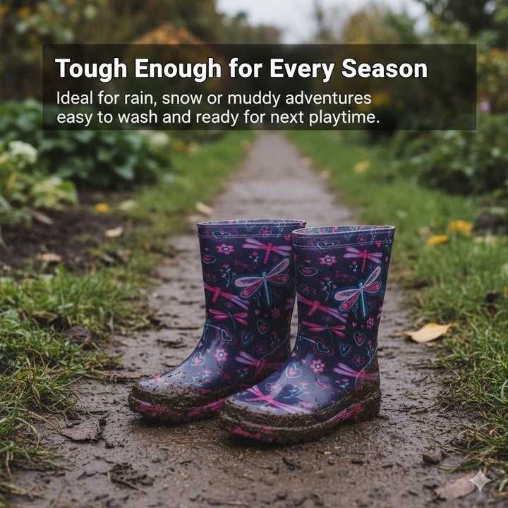 Kids Girls Dragonfly Wellington Waterproof Rain Boots with Heart & Flower Print