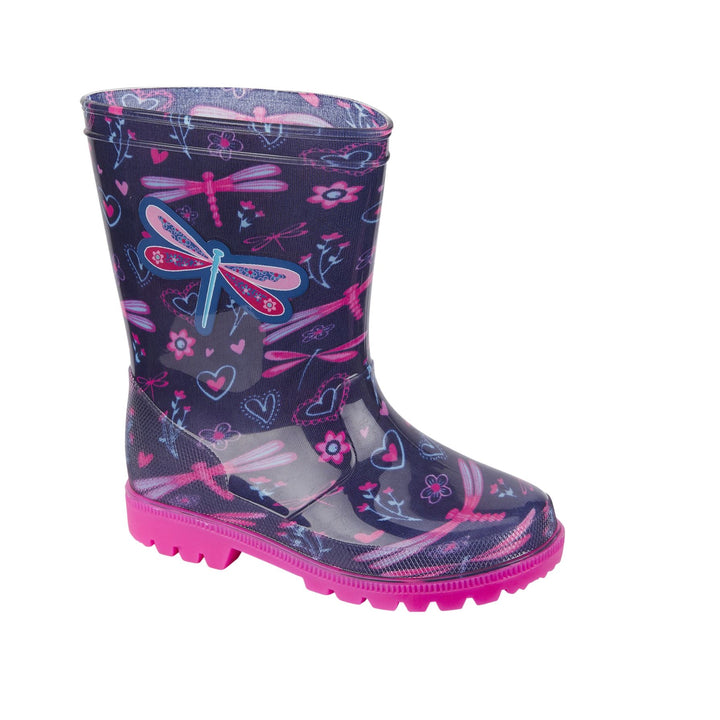 Bright and cheerful navy and pink dragonfly print with hearts and flowers makes rainy days fun and stylish. Perfect for outdoor adventures, school walks and puddle jumping, keeping your child excited to wear them whatever the weather.