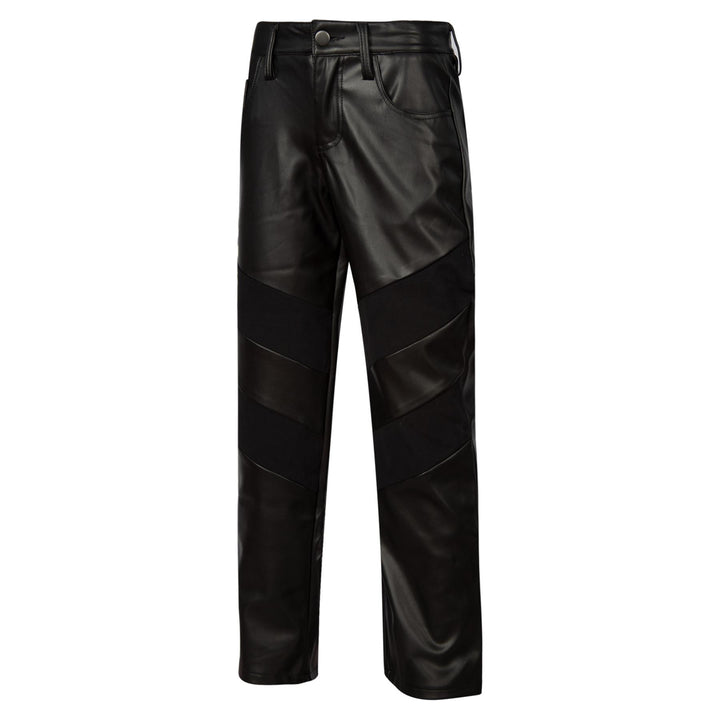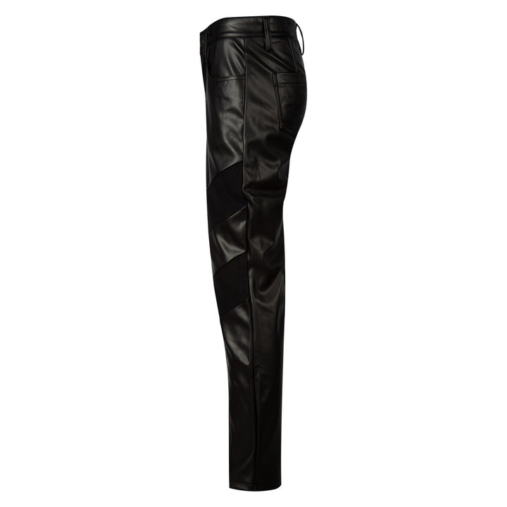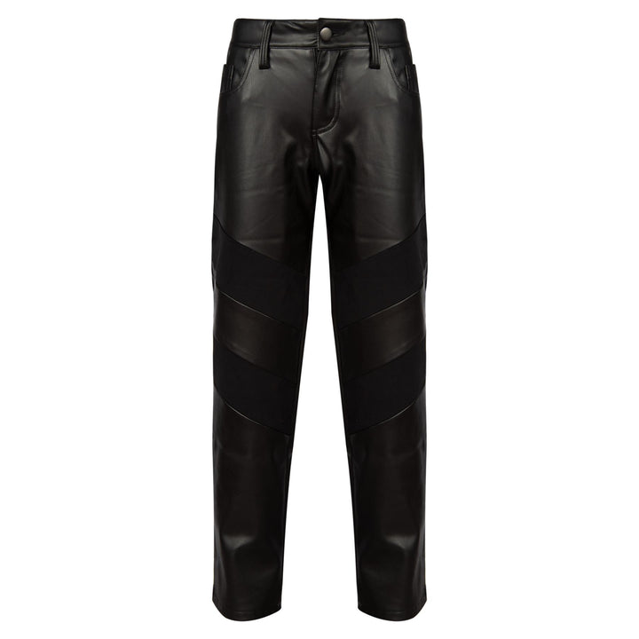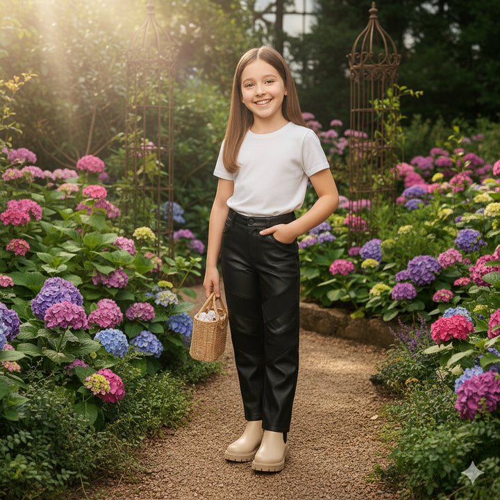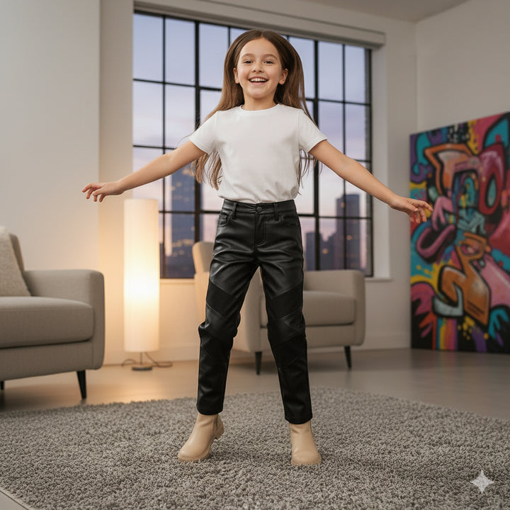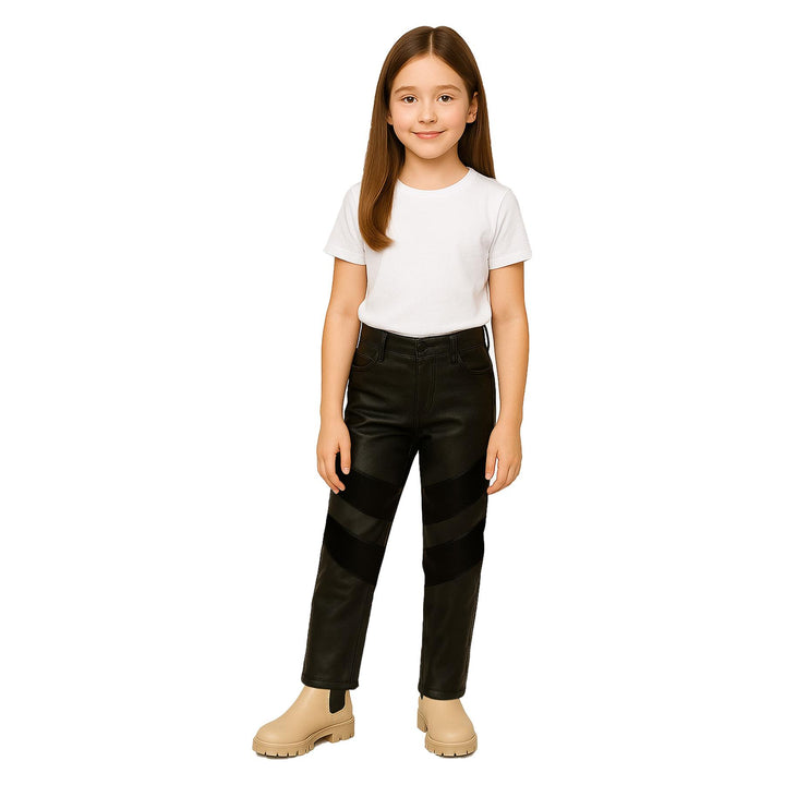 These girls' PU trousers combine fashionable edge with youthful flair, designed in sleek black faux leather and accented by diagonal matte contrast panels. The unique geometric sections on the thighs create a dynamic, modern look, perfect for trendsetters seeking to elevate their streetwear or casual wardrobe.