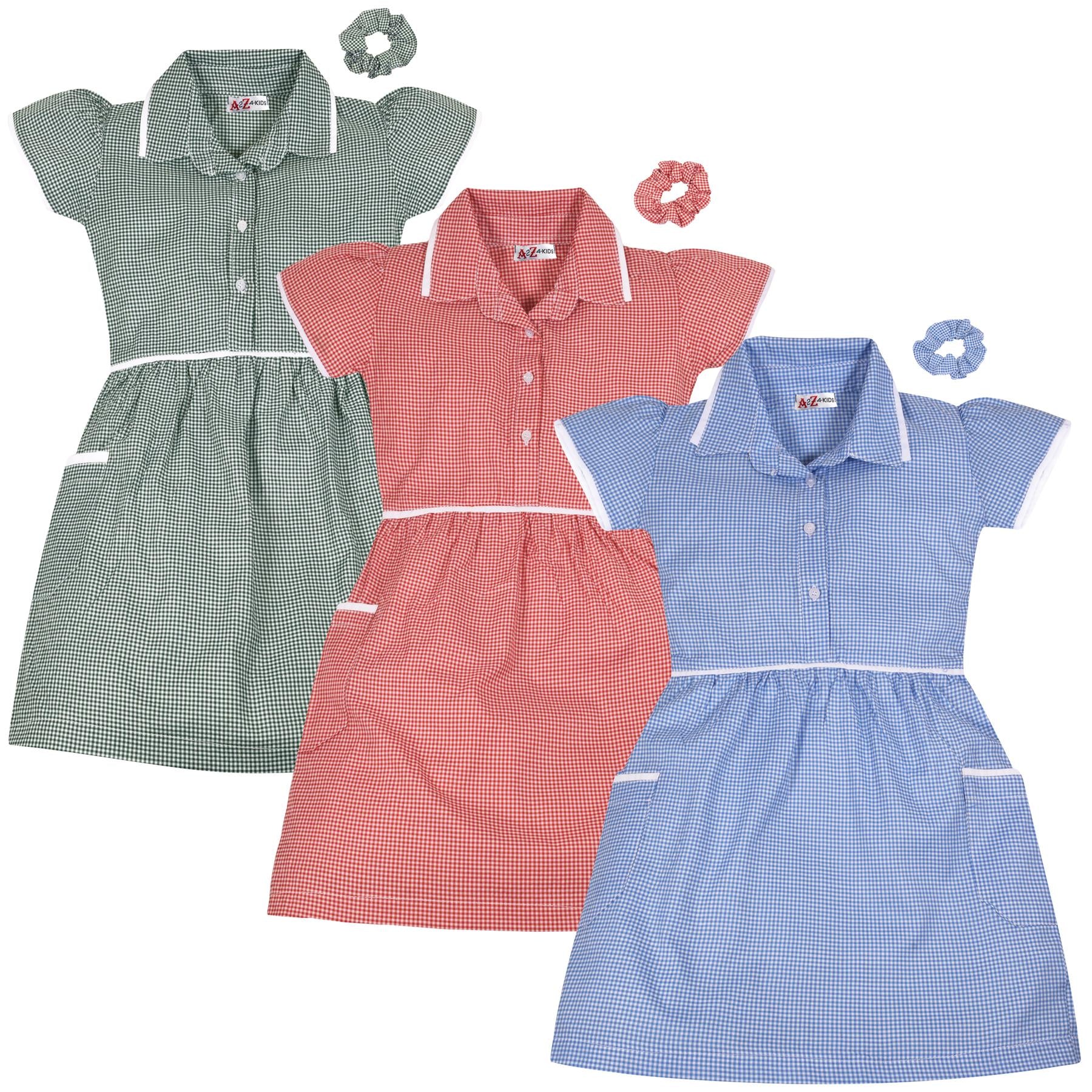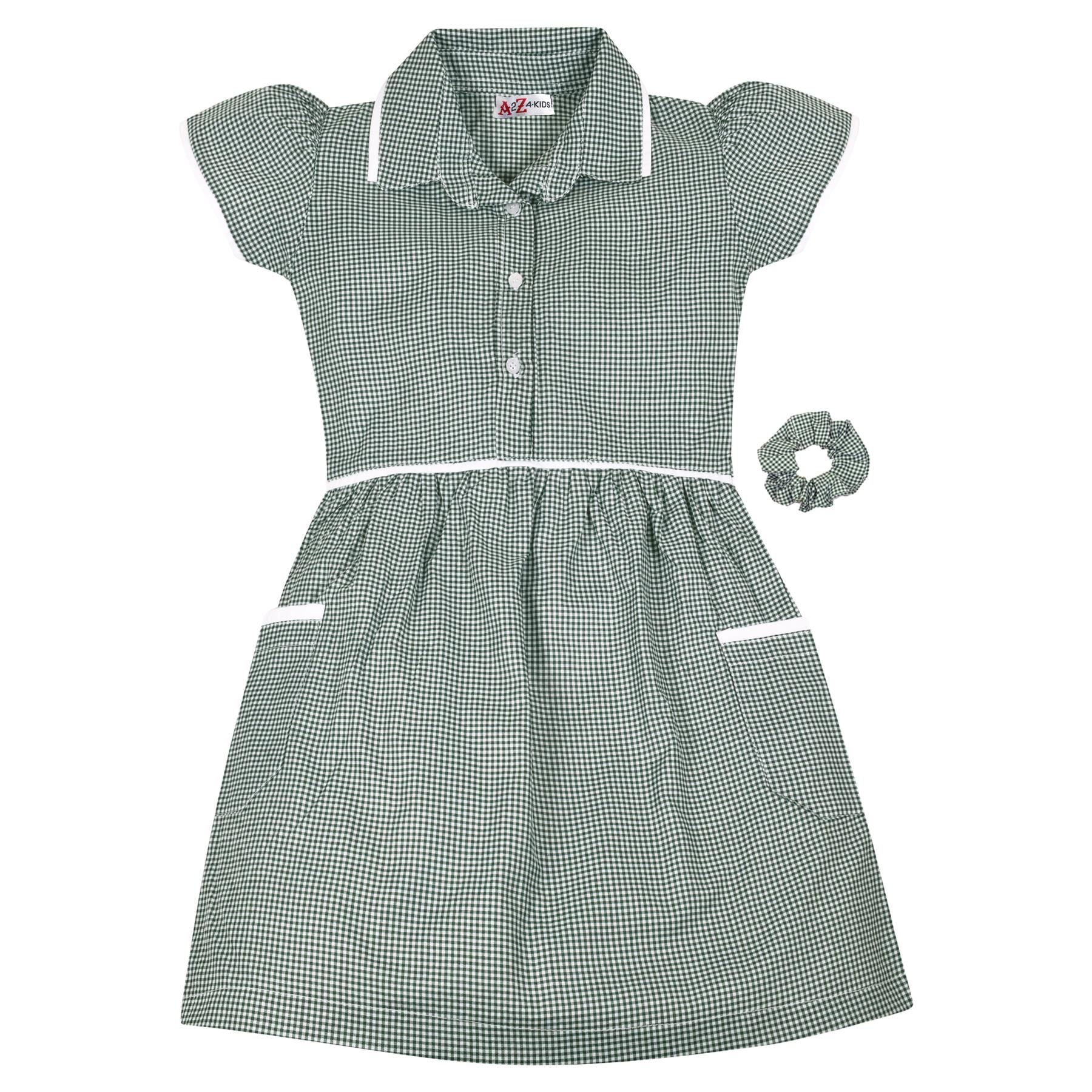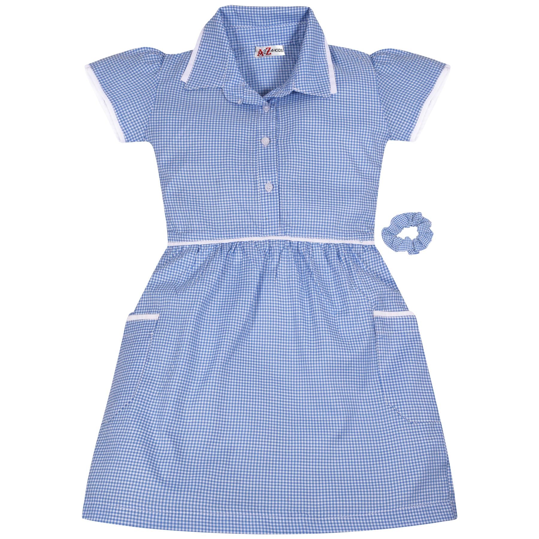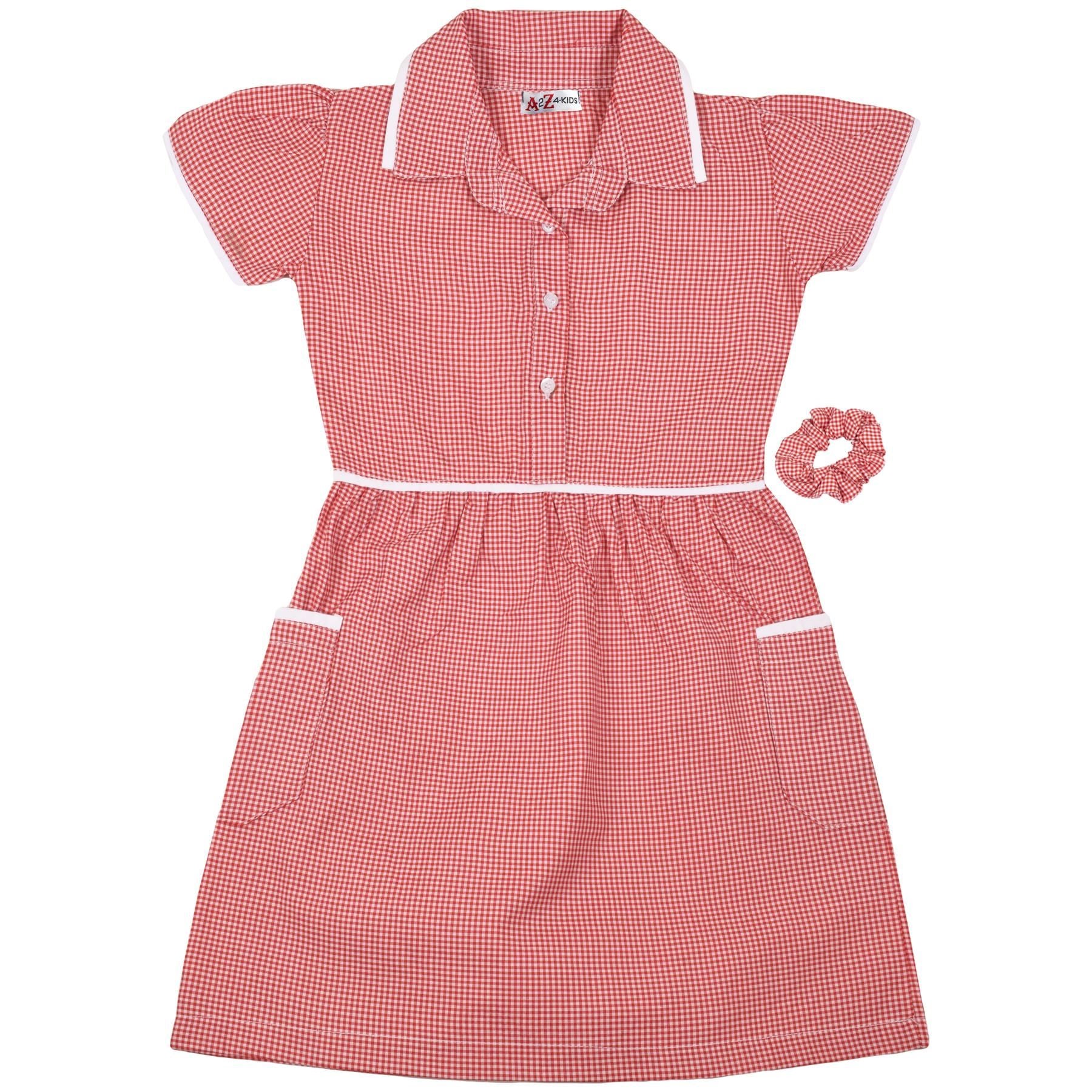 Kids Girls Gingham School Dress Check Dresses With Matching Scrunchies 2-14