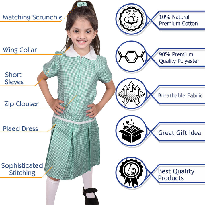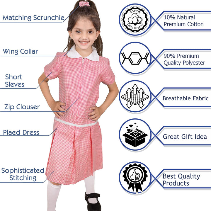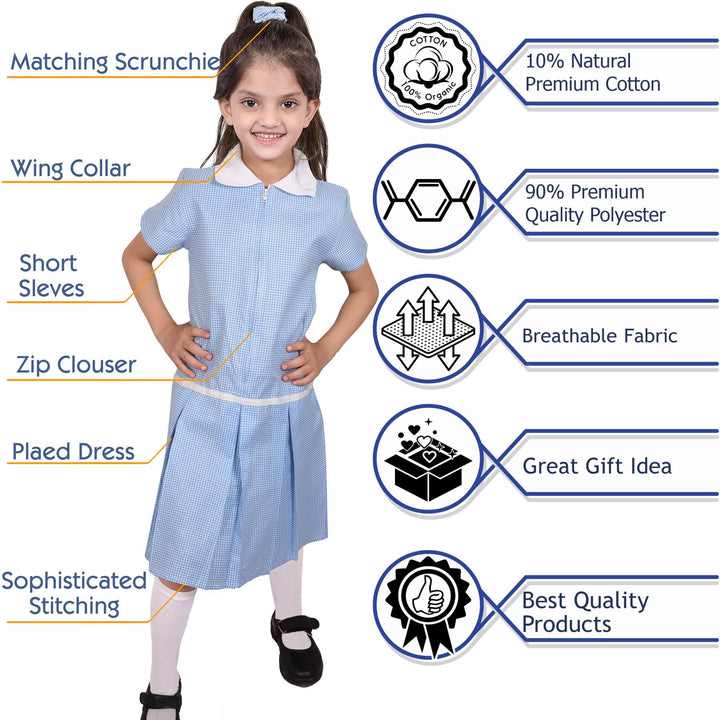 Kids Girls Gingham School Dress Zip Up Check Dresses With Matching Scrunchies