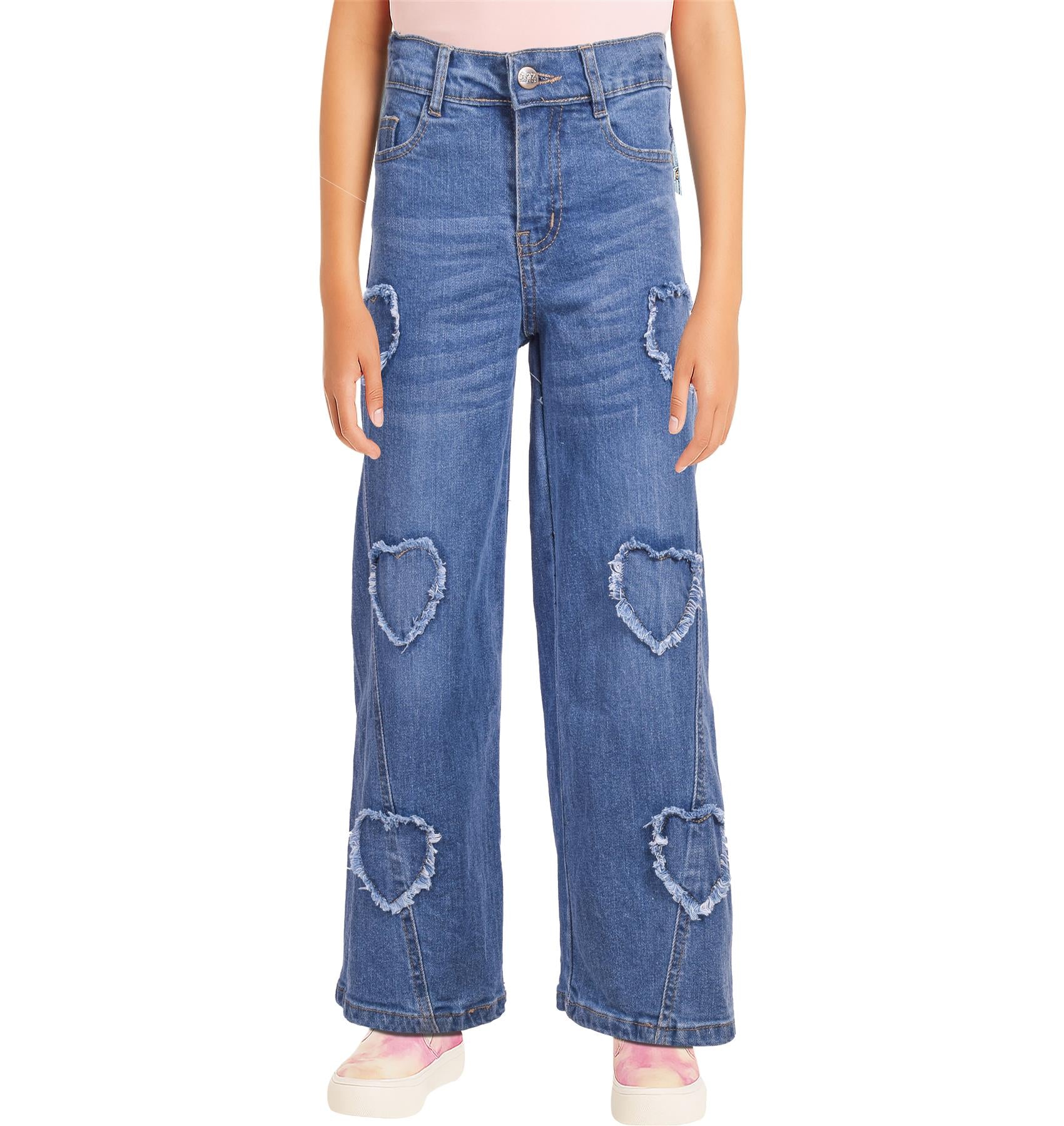 Kids Girls High Waist Wide Leg Denim Palazzo Jeans Distressed Heart Trousers