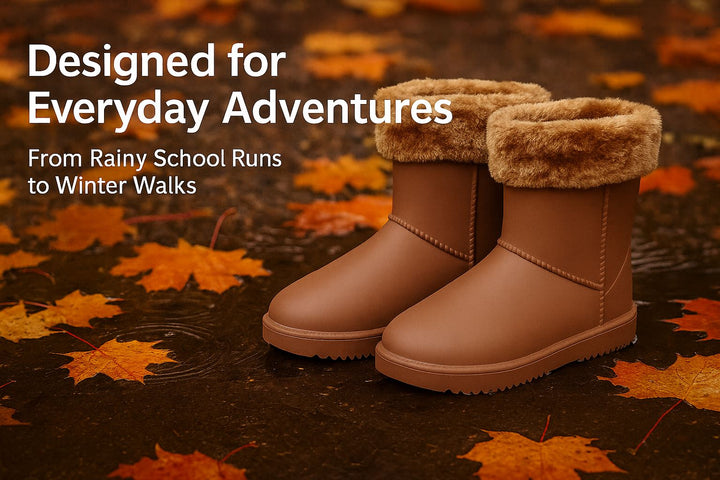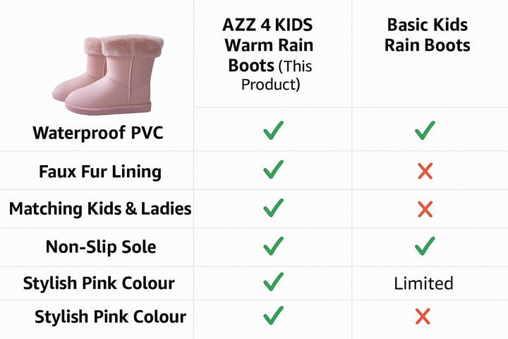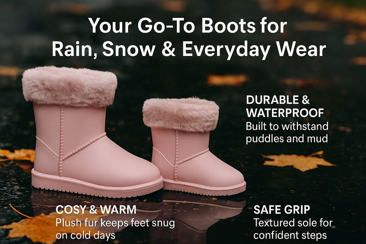Designed with a soft polyester lining and cushioned insole, these waterproof boots keep feet cosy and supported all day. The plush faux fur trim adds extra warmth, making them perfect for chilly, rainy, or snowy days. Kids and ladies can enjoy comfort whether walking to school, shopping, or exploring outdoors.