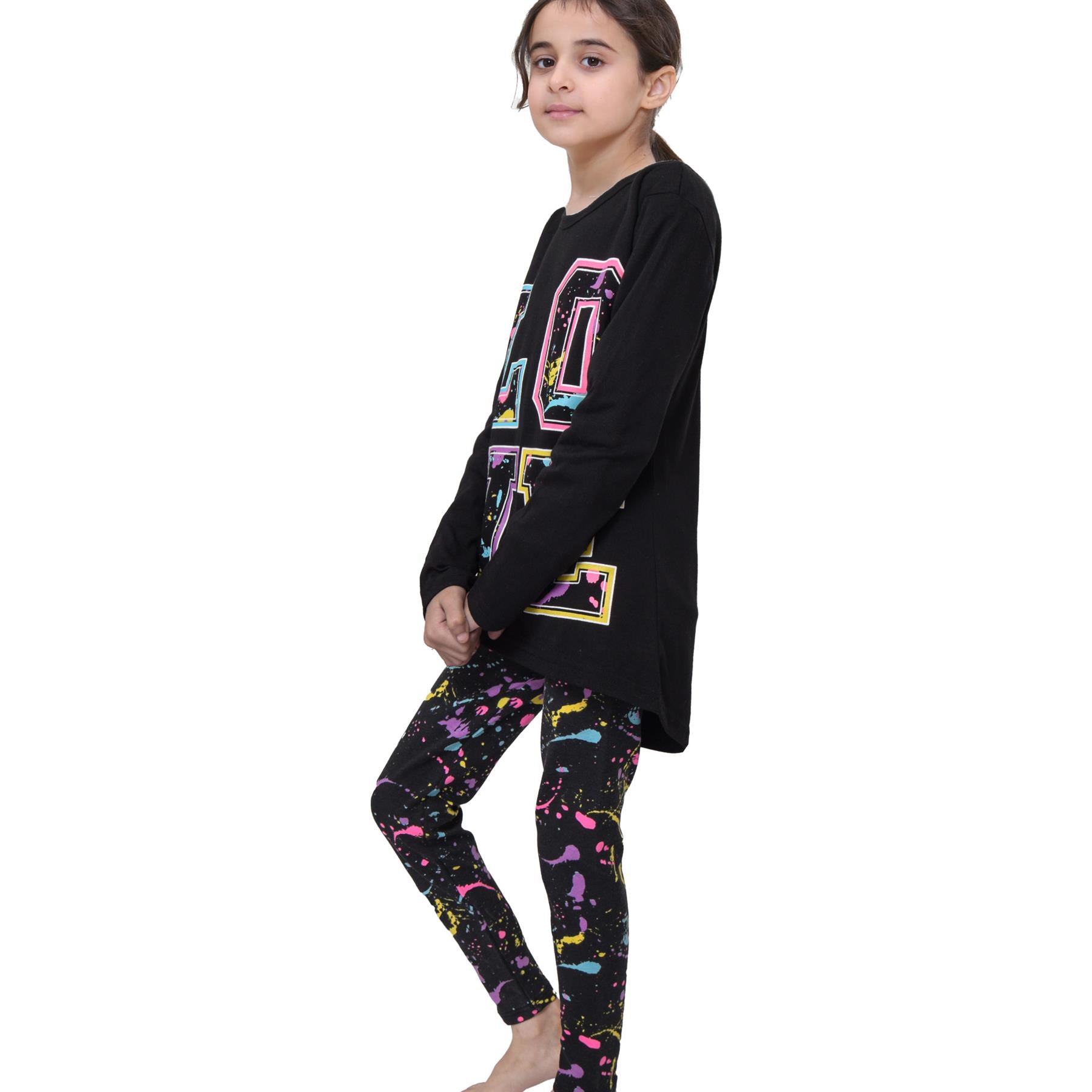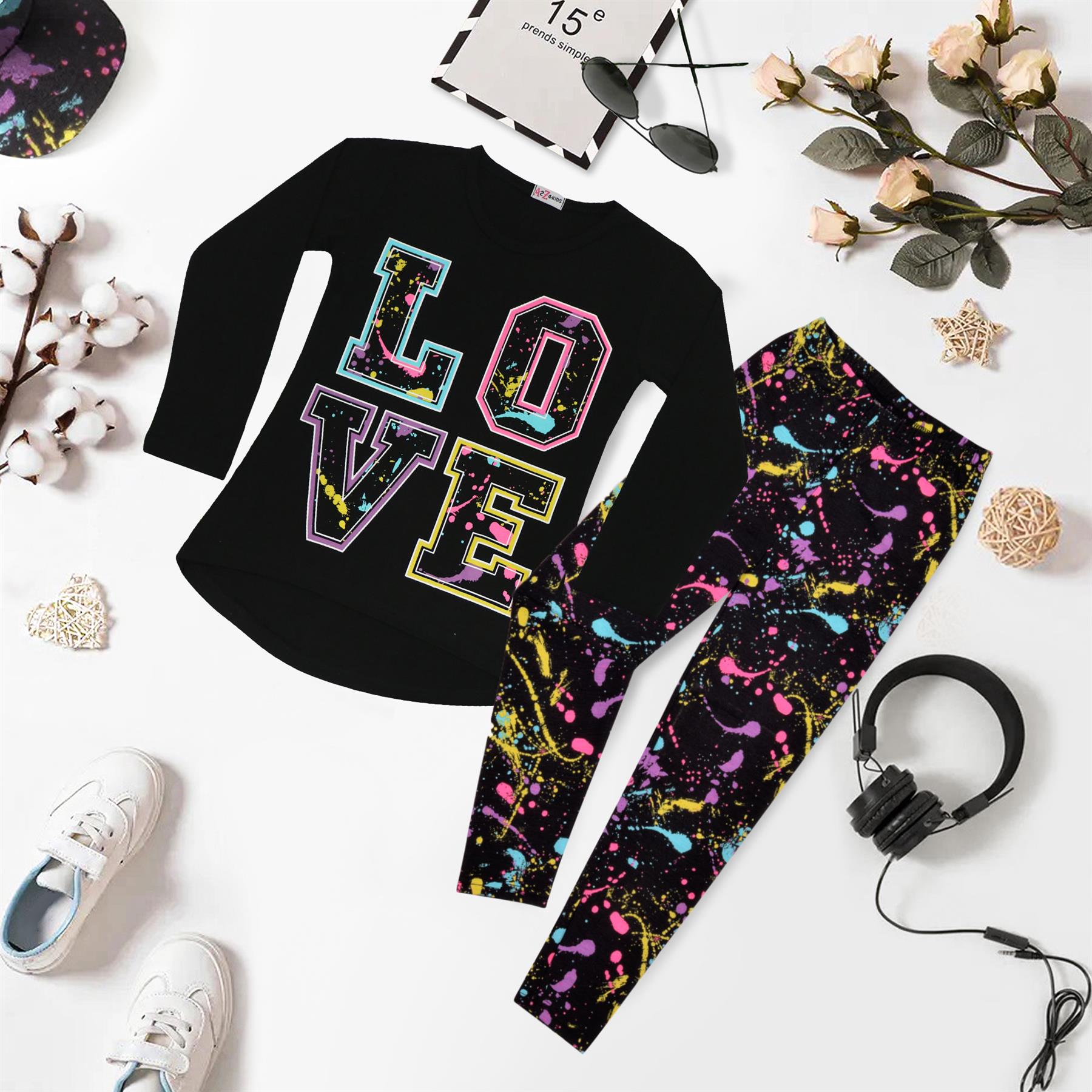 Kids Girls Long Sleeves Love Print Black T Shirt Top & Splash Legging Outfit Set