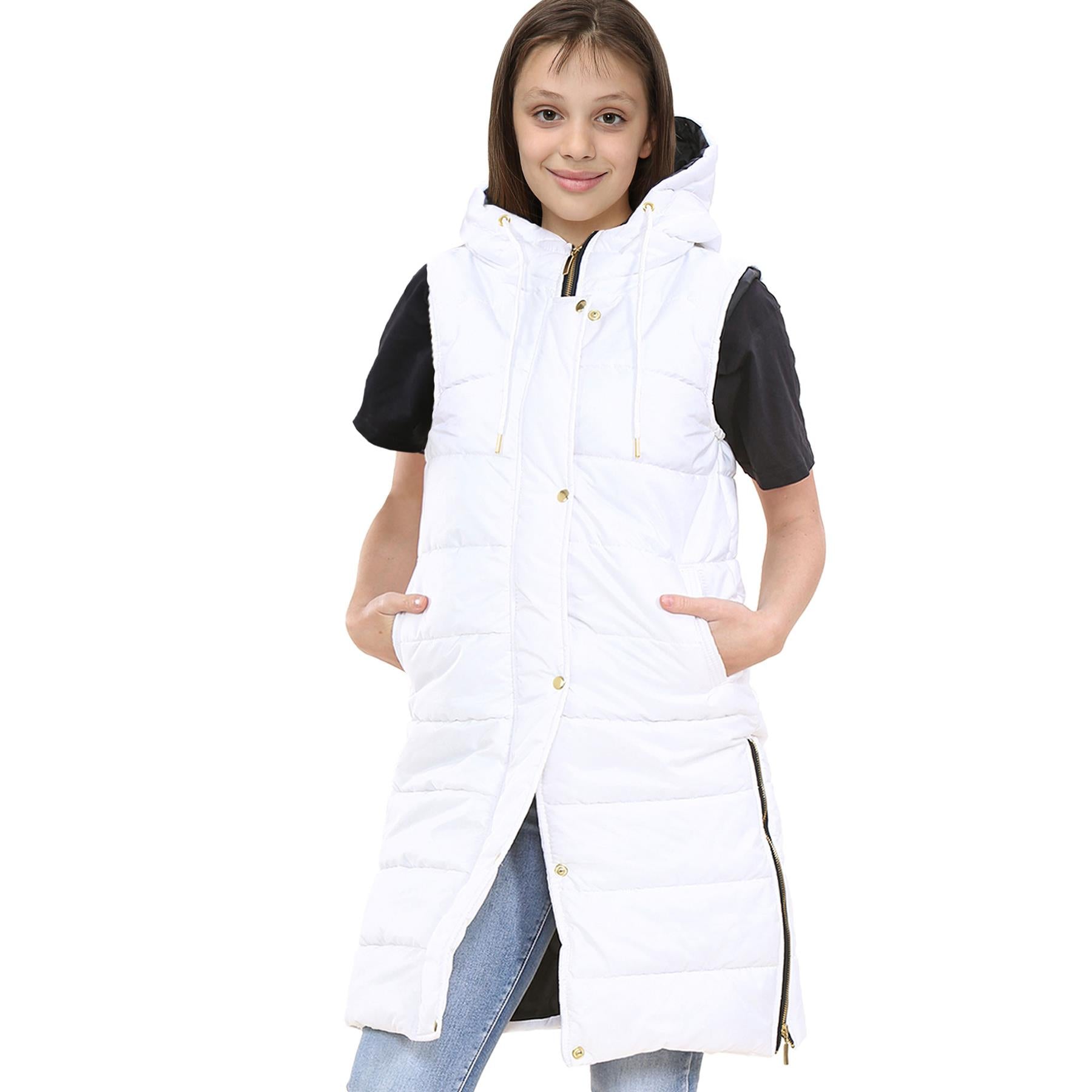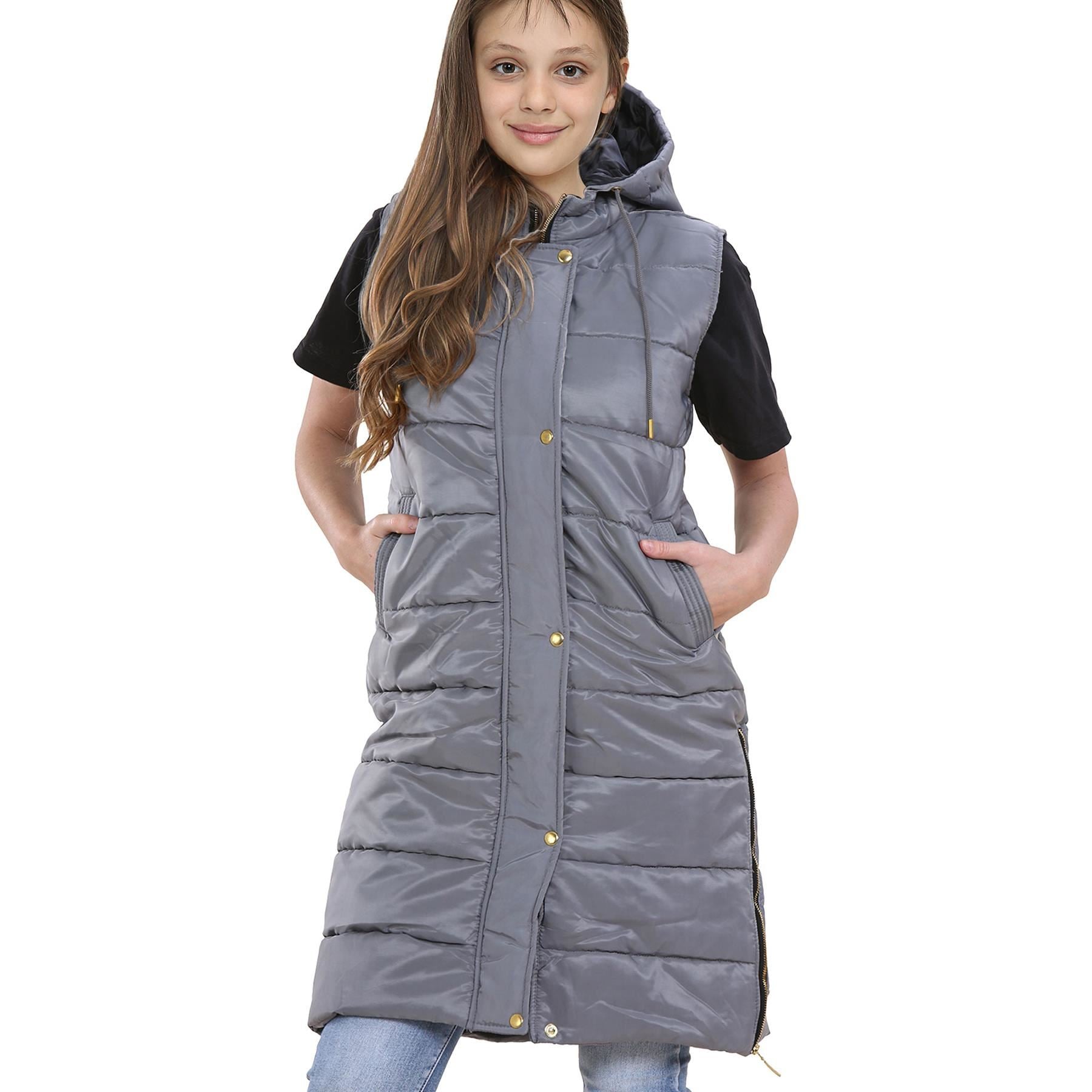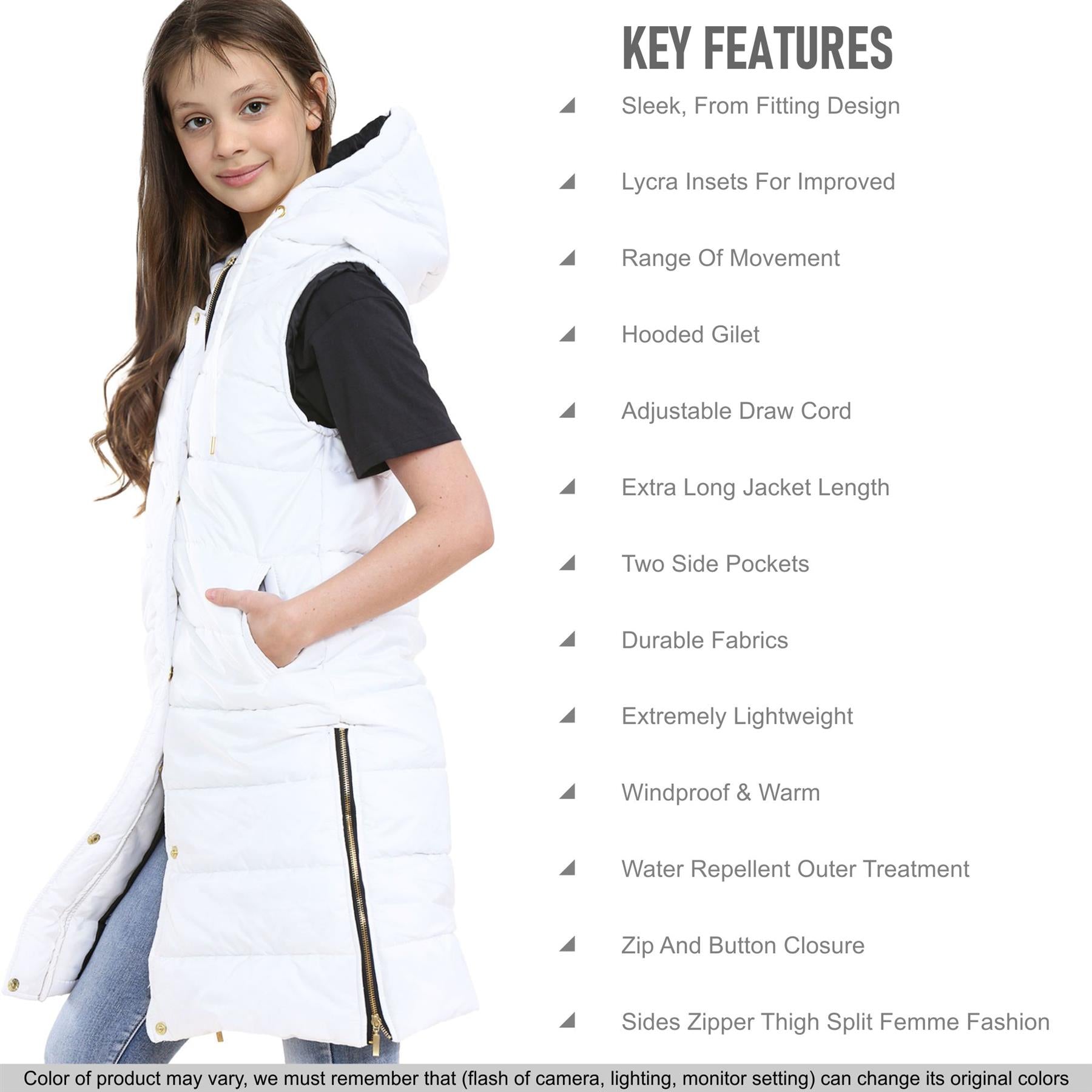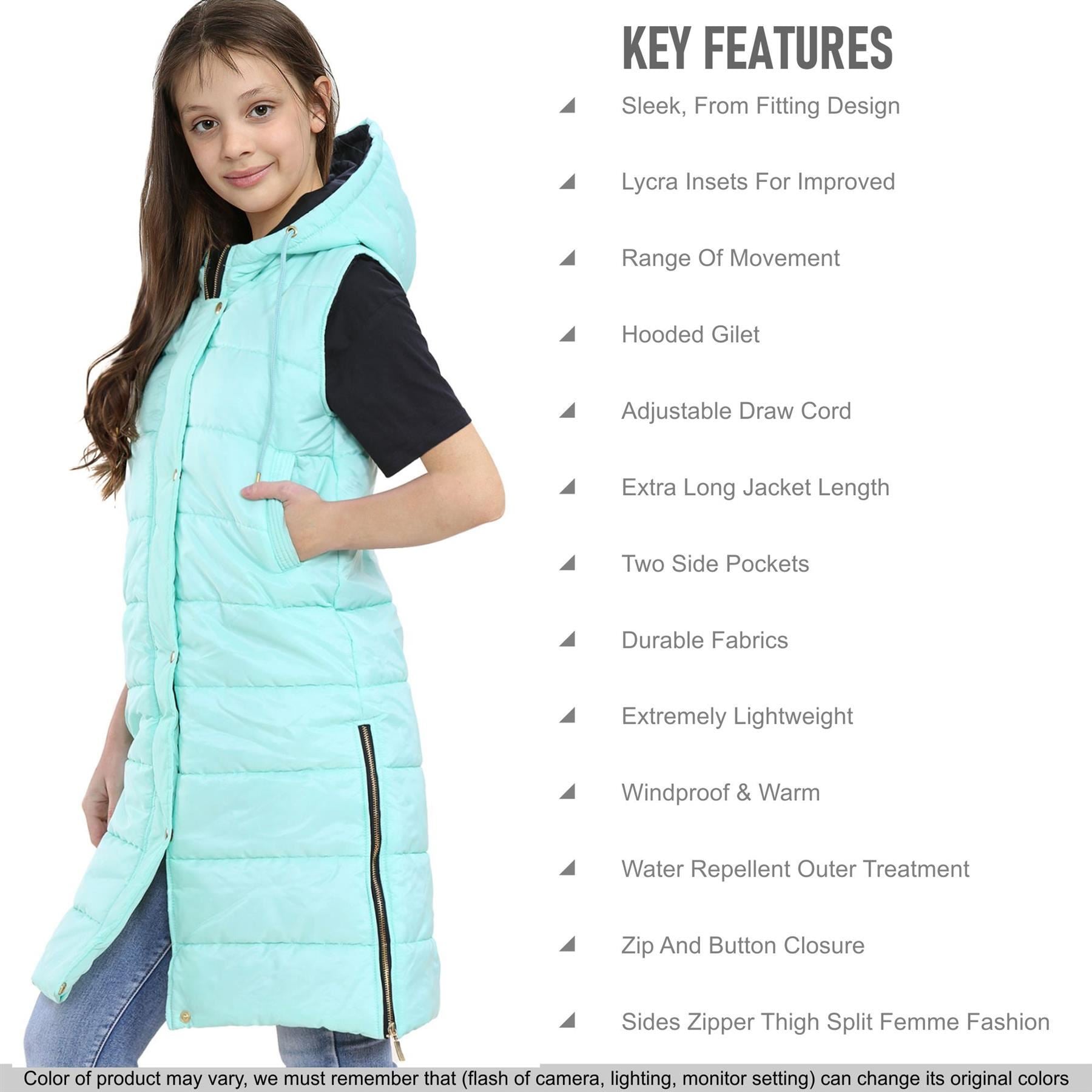 Kids Girls Oversized Gilet Long Line Hooded Quilted Jacket Long Sleeveless Coat