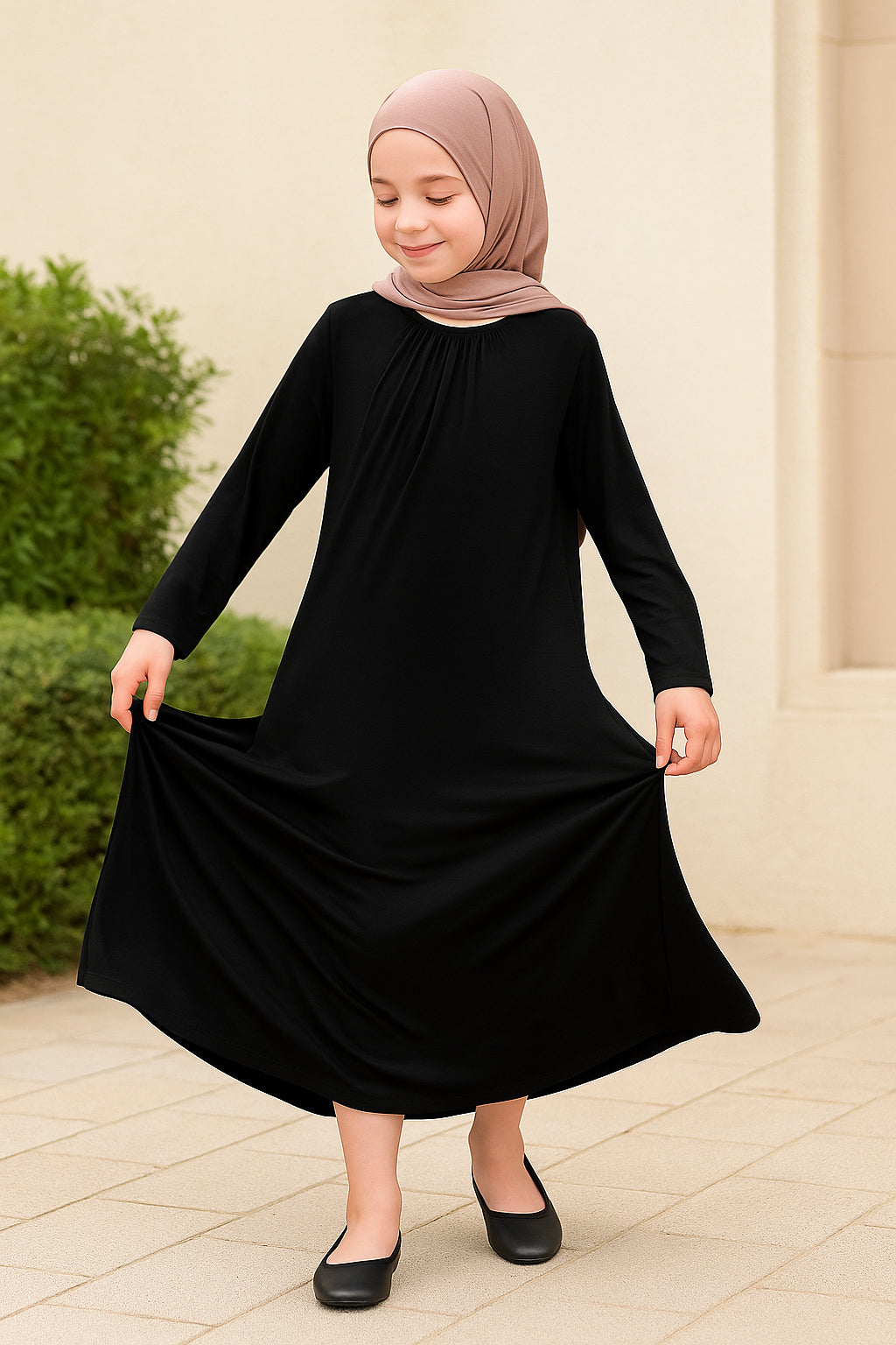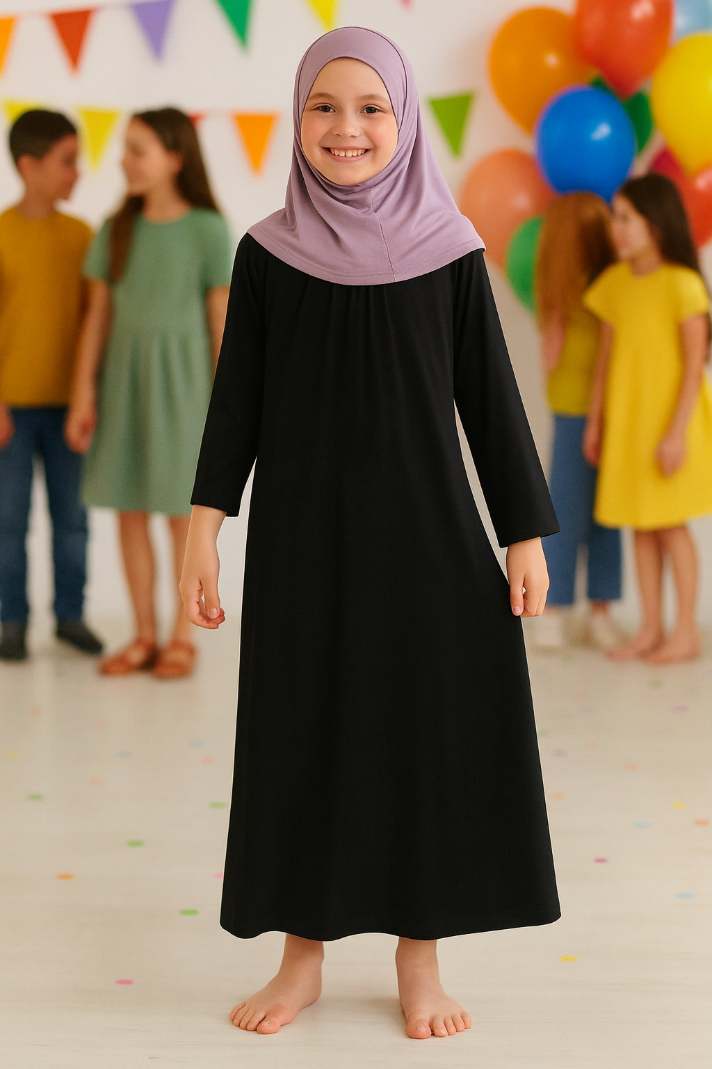 Perfect for school, mosque, religious gatherings, Eid celebrations or family occasions. Its classic plain black design can easily be paired with a hijab, cardigan or accessories to create a personalised, modest outfit for your child. -