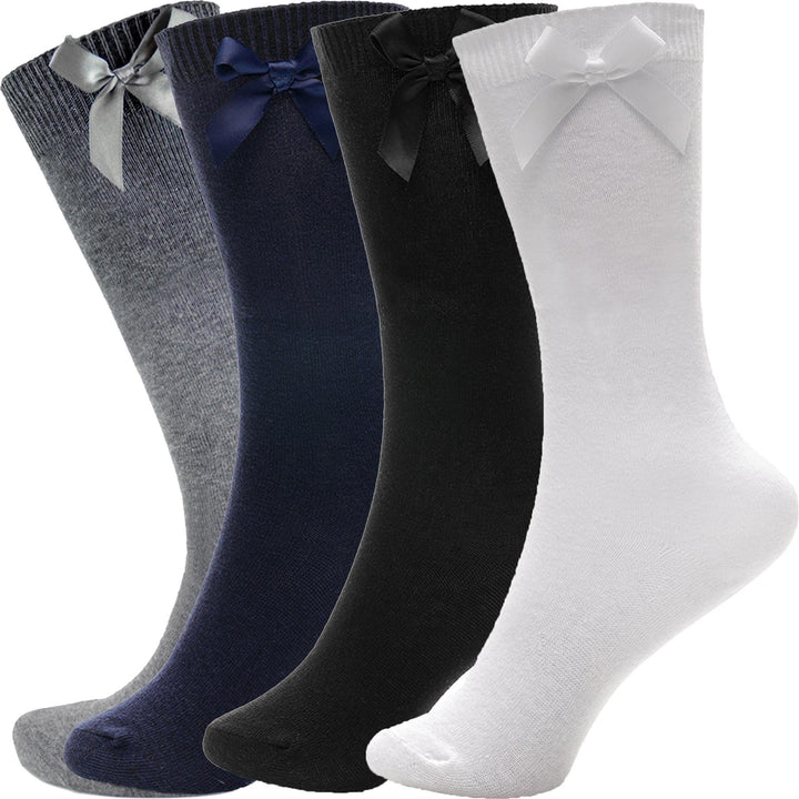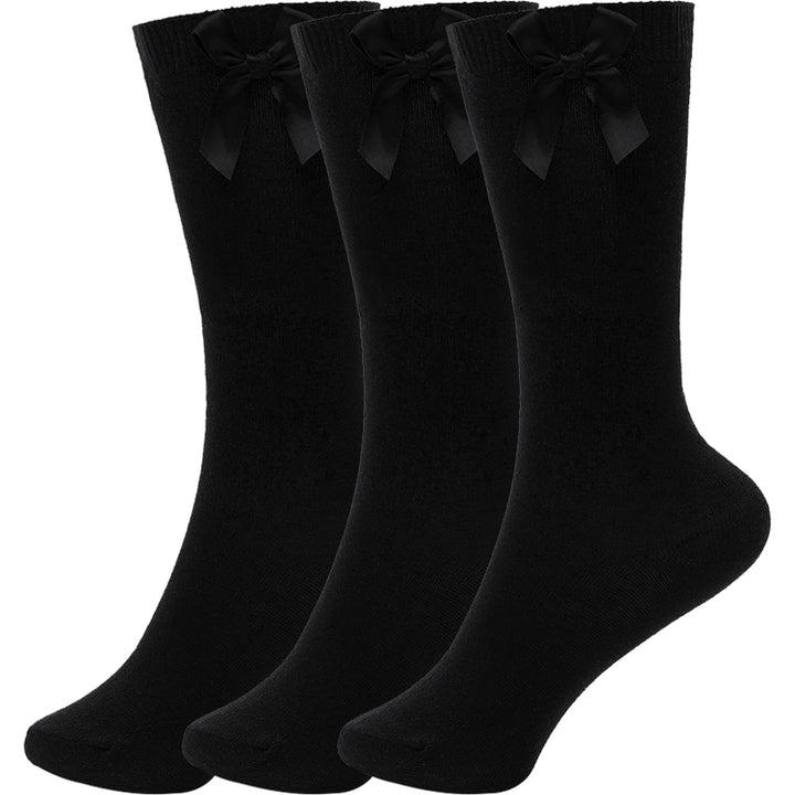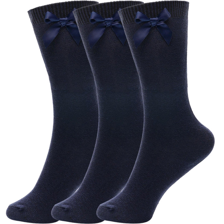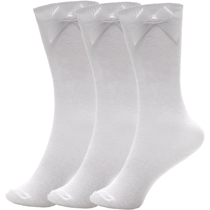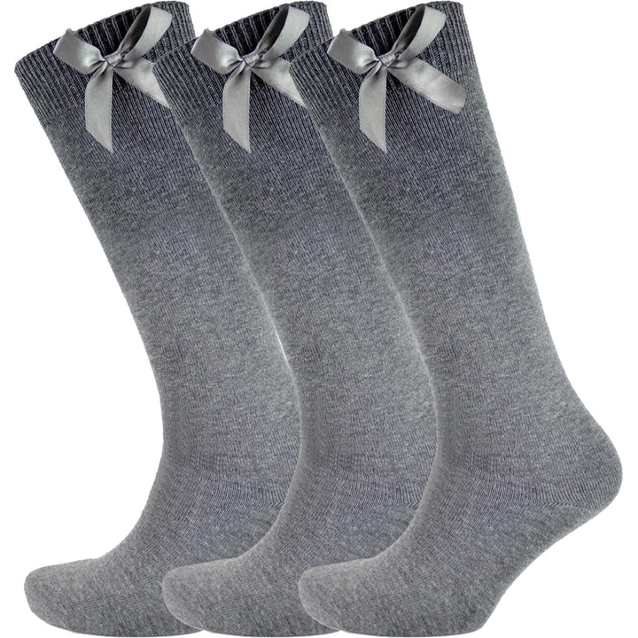 Kids Girls Plain Knee High Socks With Ribbon Bow Pack of 3 School Cotton Socks