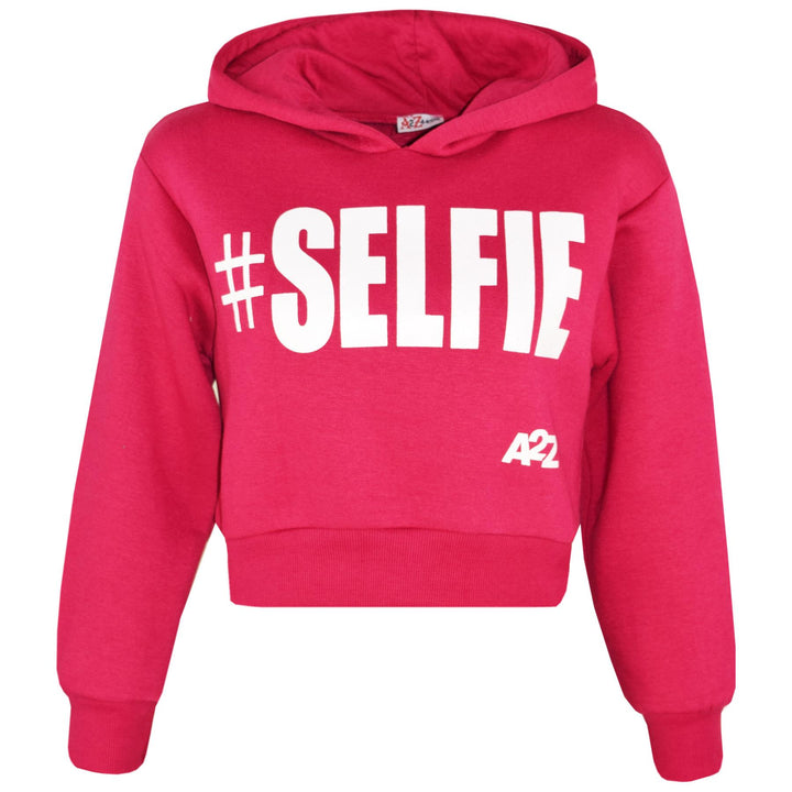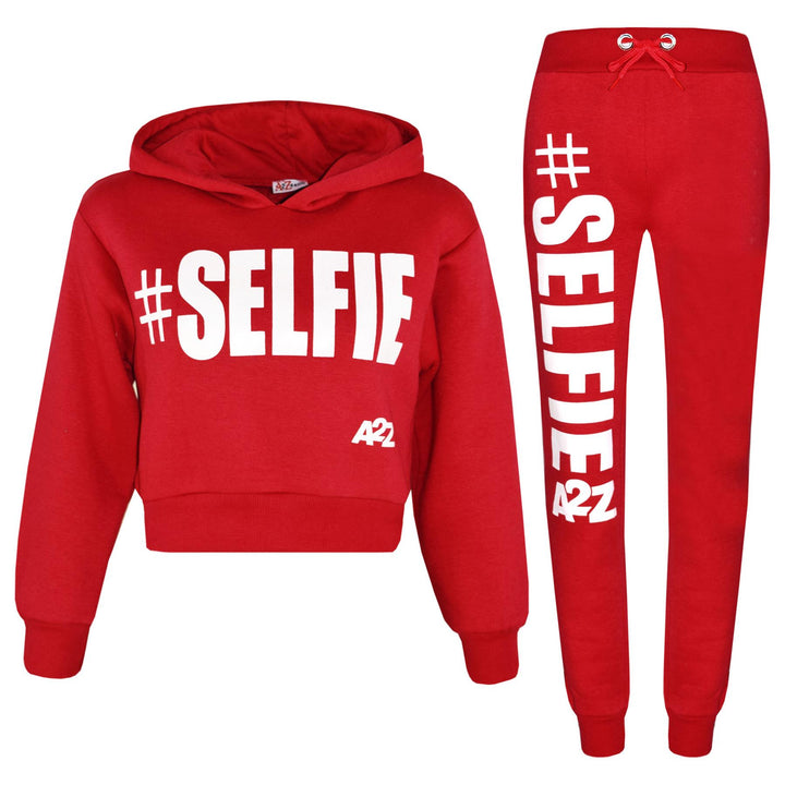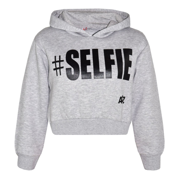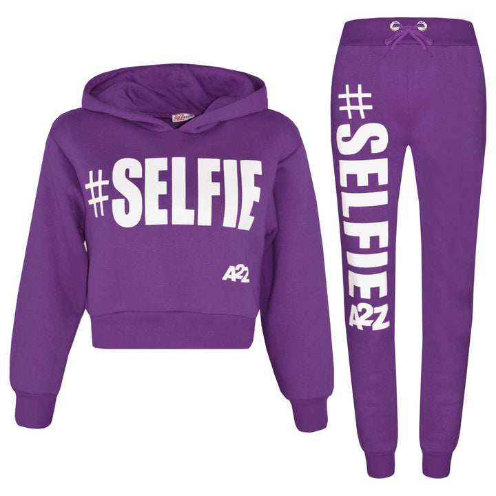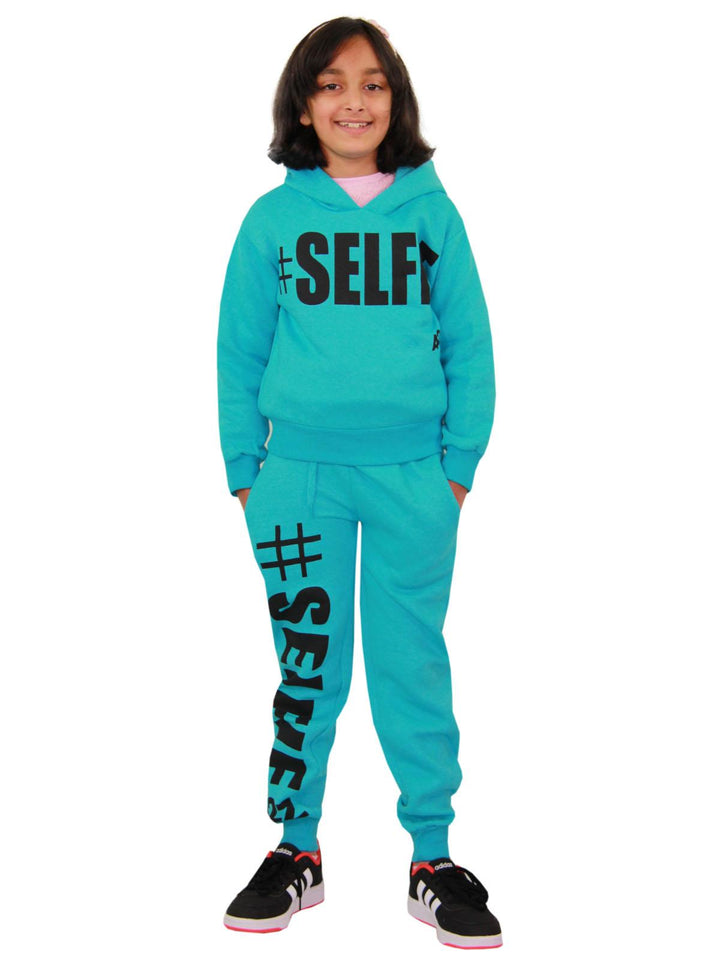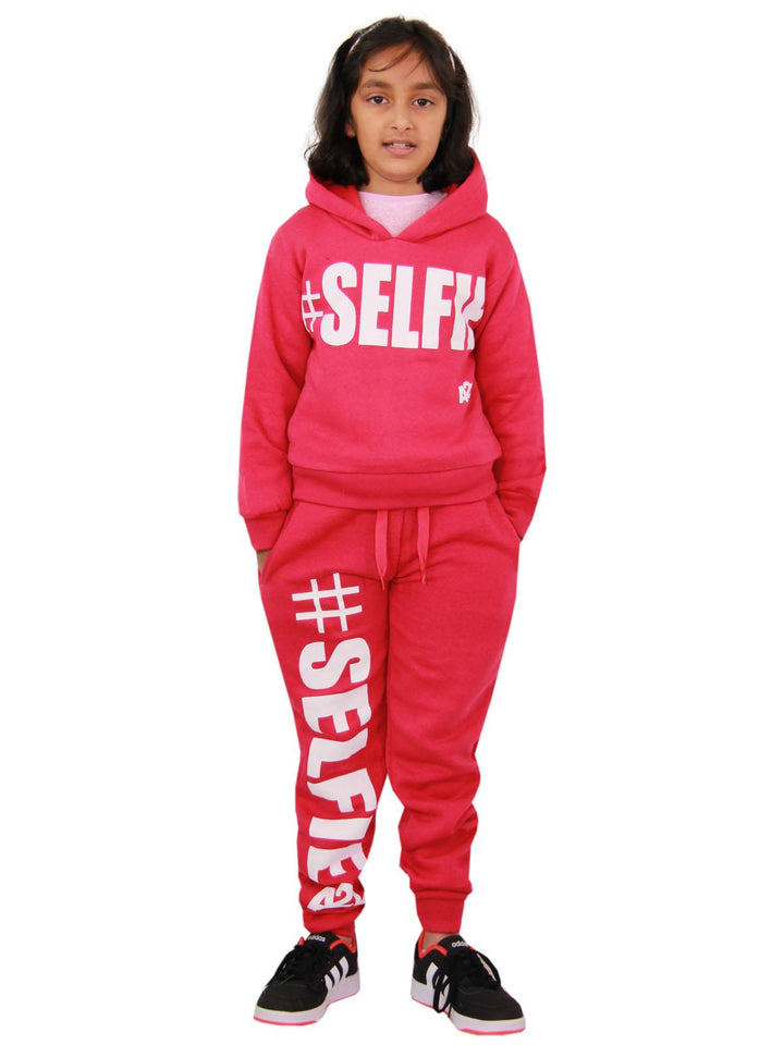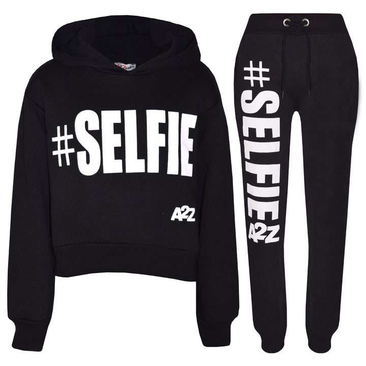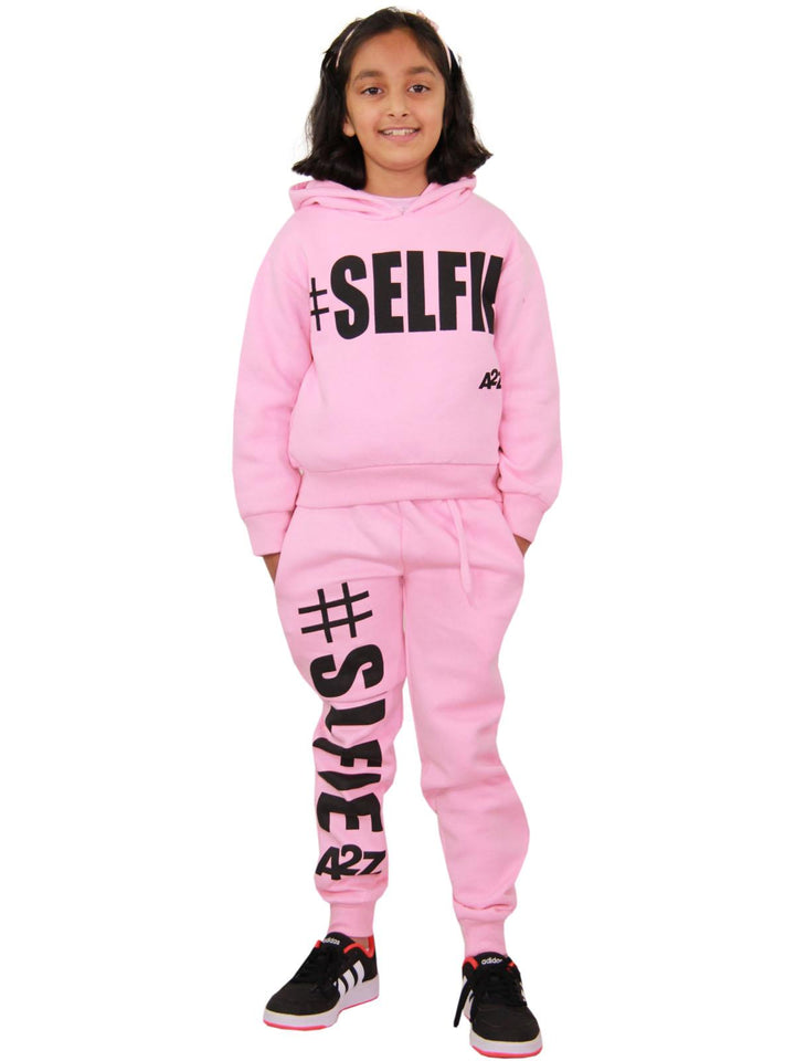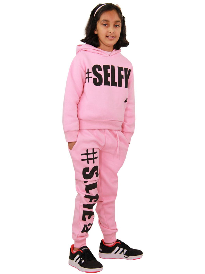 Kids Girls #Selfie Printed Hooded Crop Top & Bottom Jogging Suit