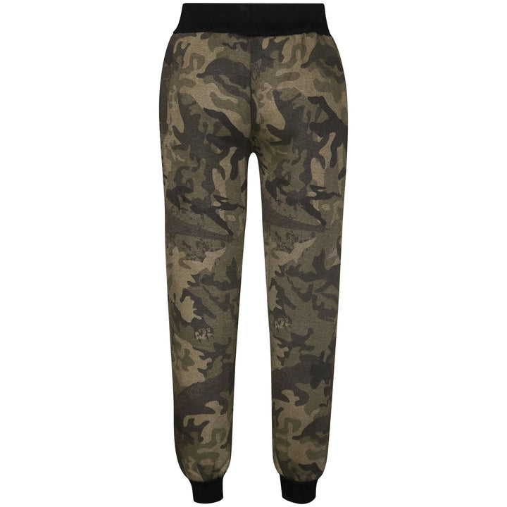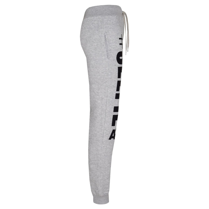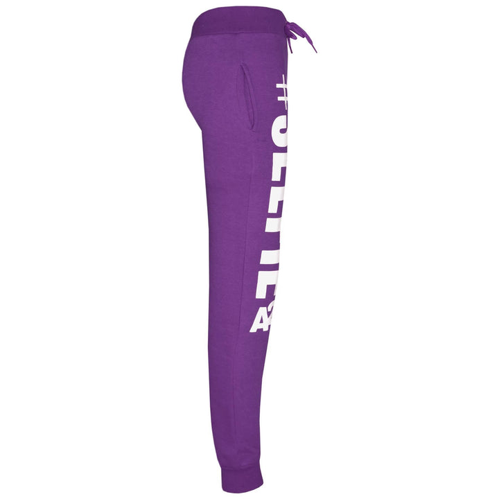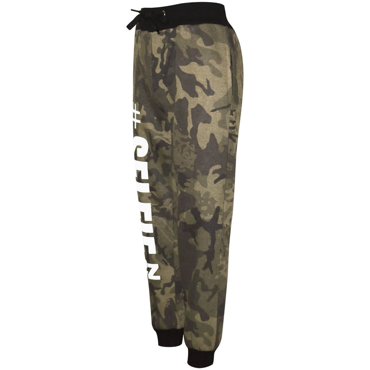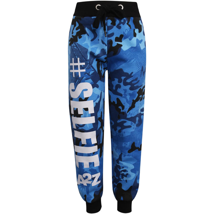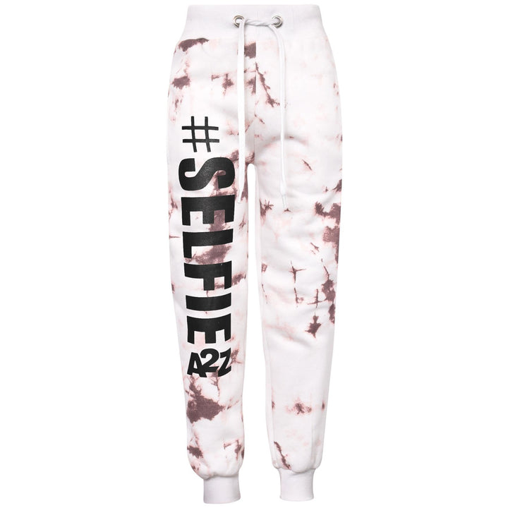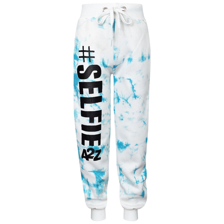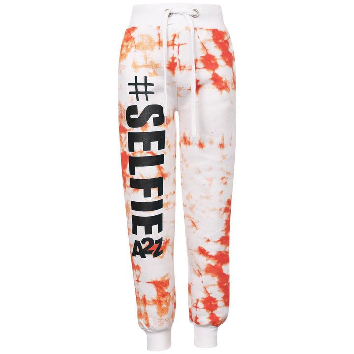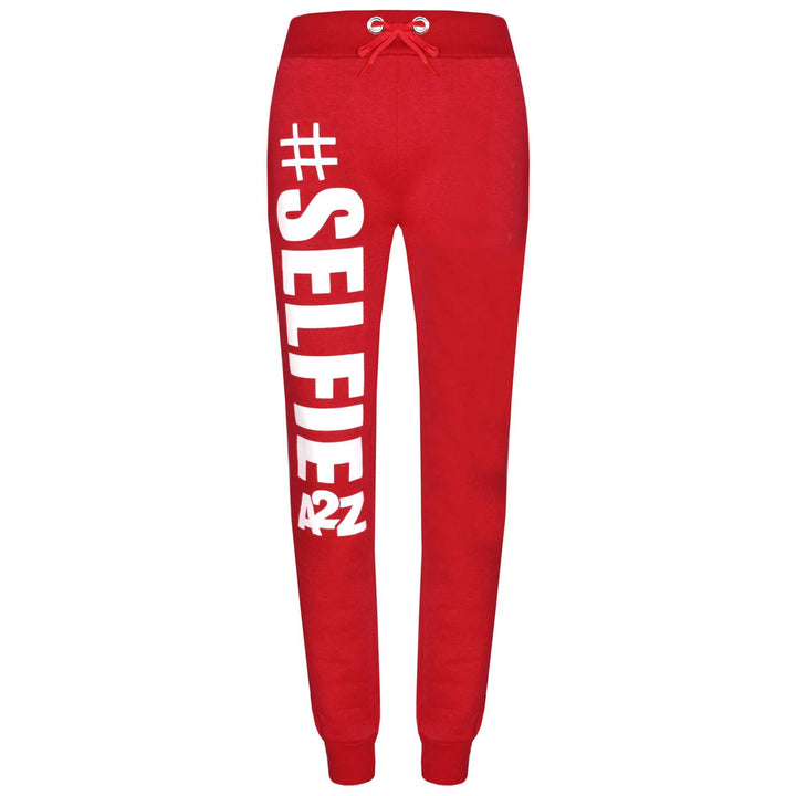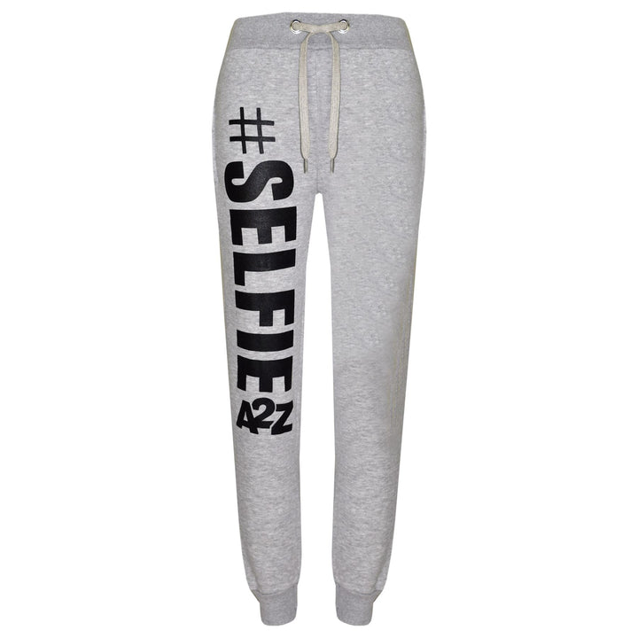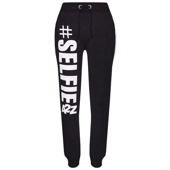 joggers with an adjustable drawcord waist and cuffed at the ankles, and #SELFIE printed down the front of a leg.