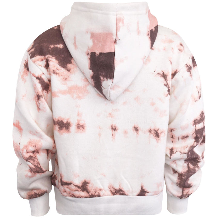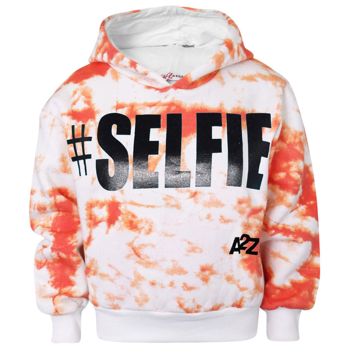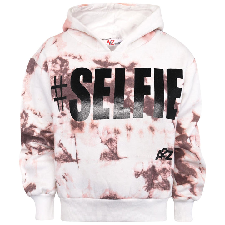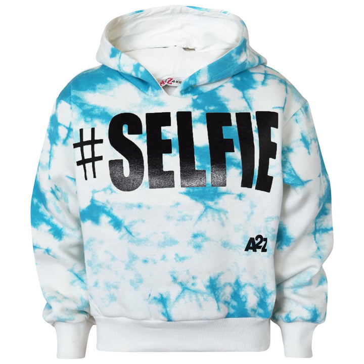 Featuring a tie dye cropped hoodie with cuffed sleeves and a hood, and #SELFIE printed across the front, and matching