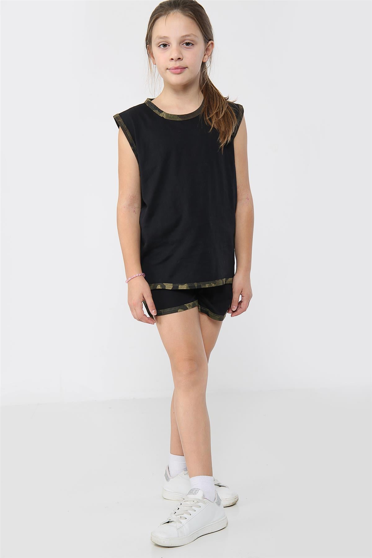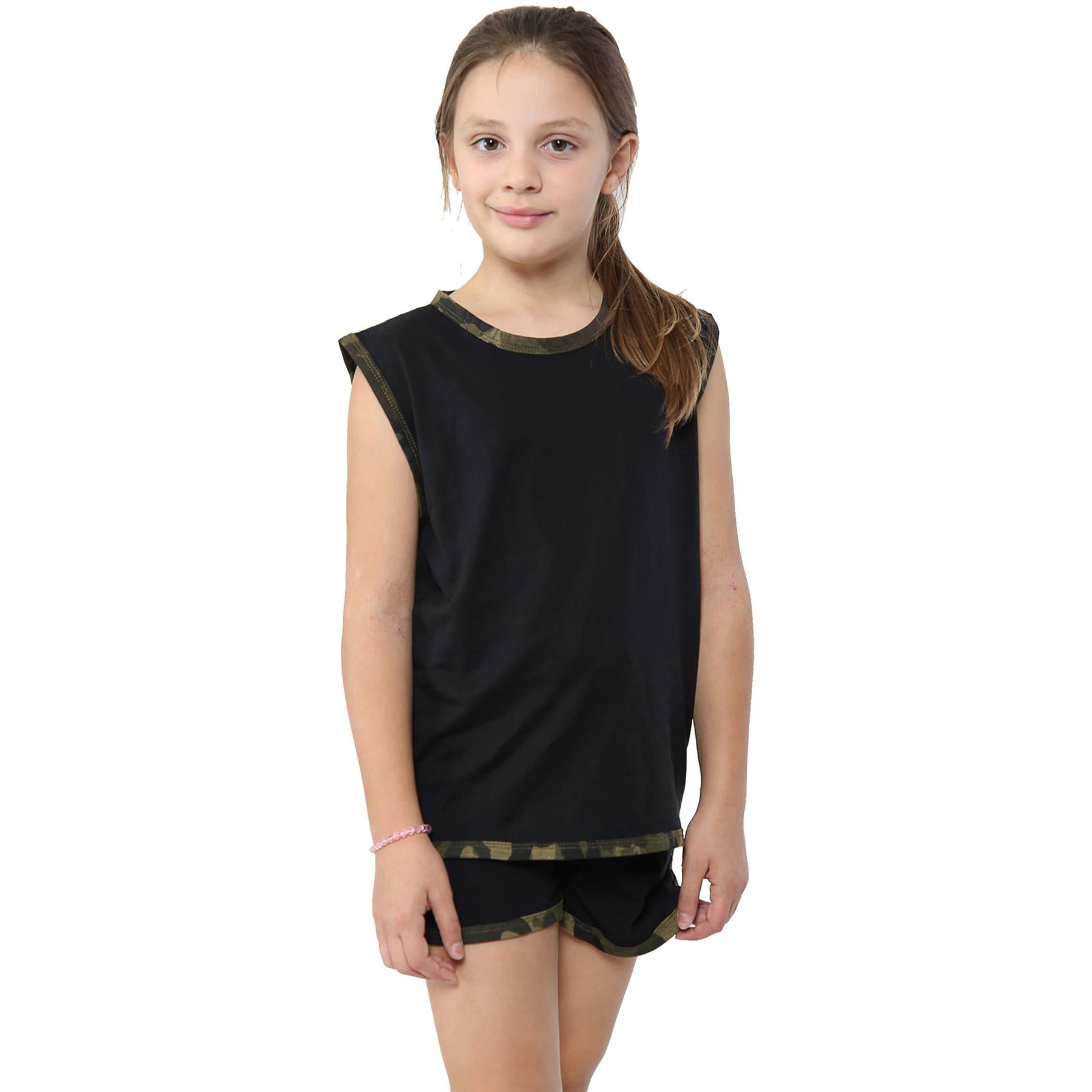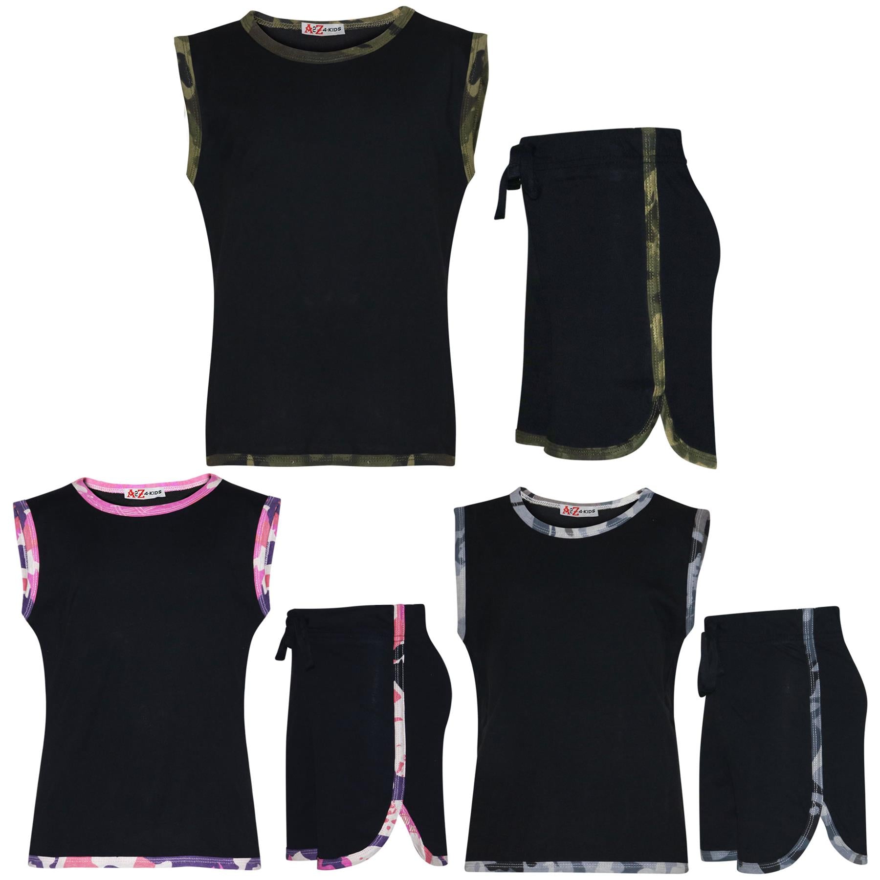 Kids Girls Shorts Set 100% Cotton Camouflage Taped Summer Vest Top Short 5-13 Yr