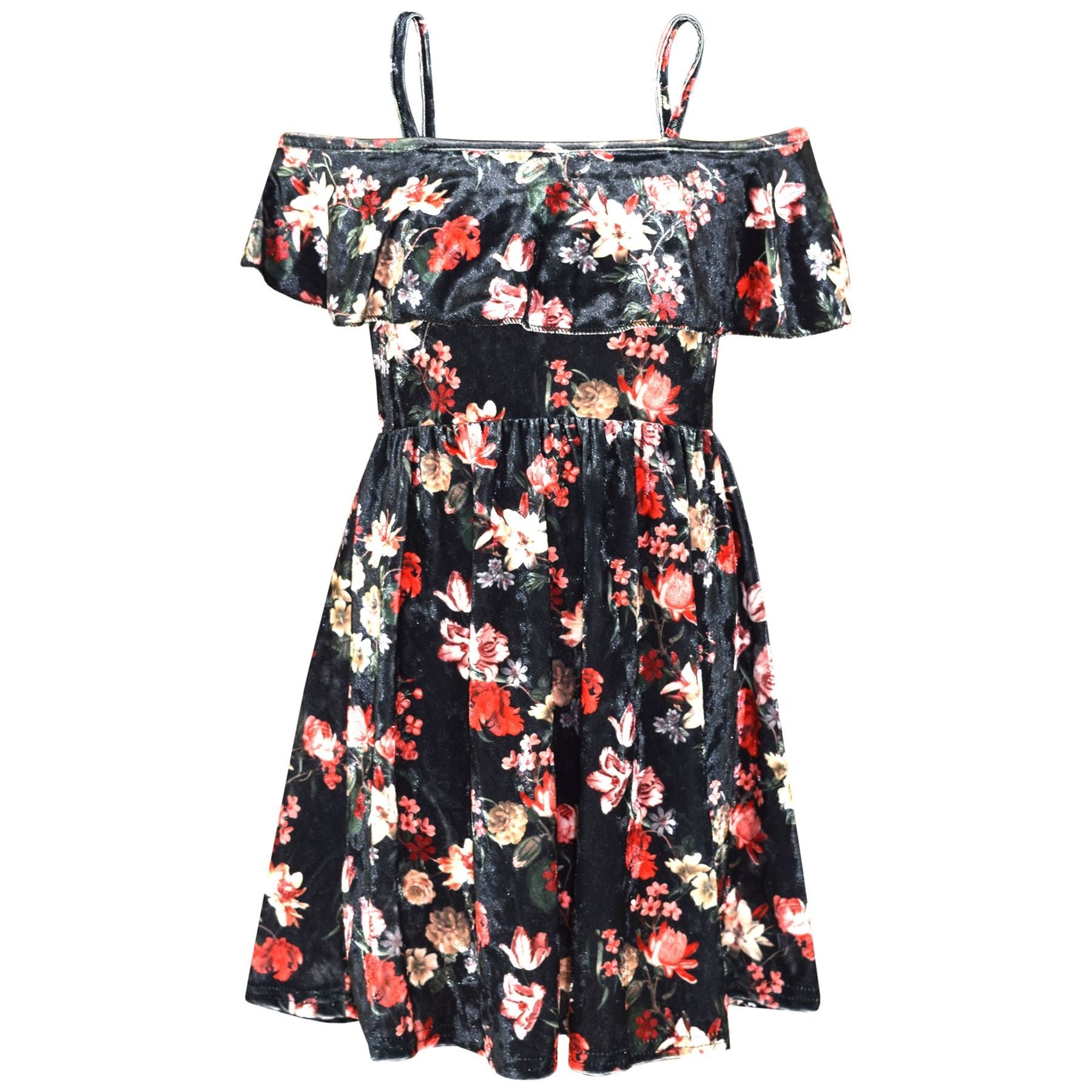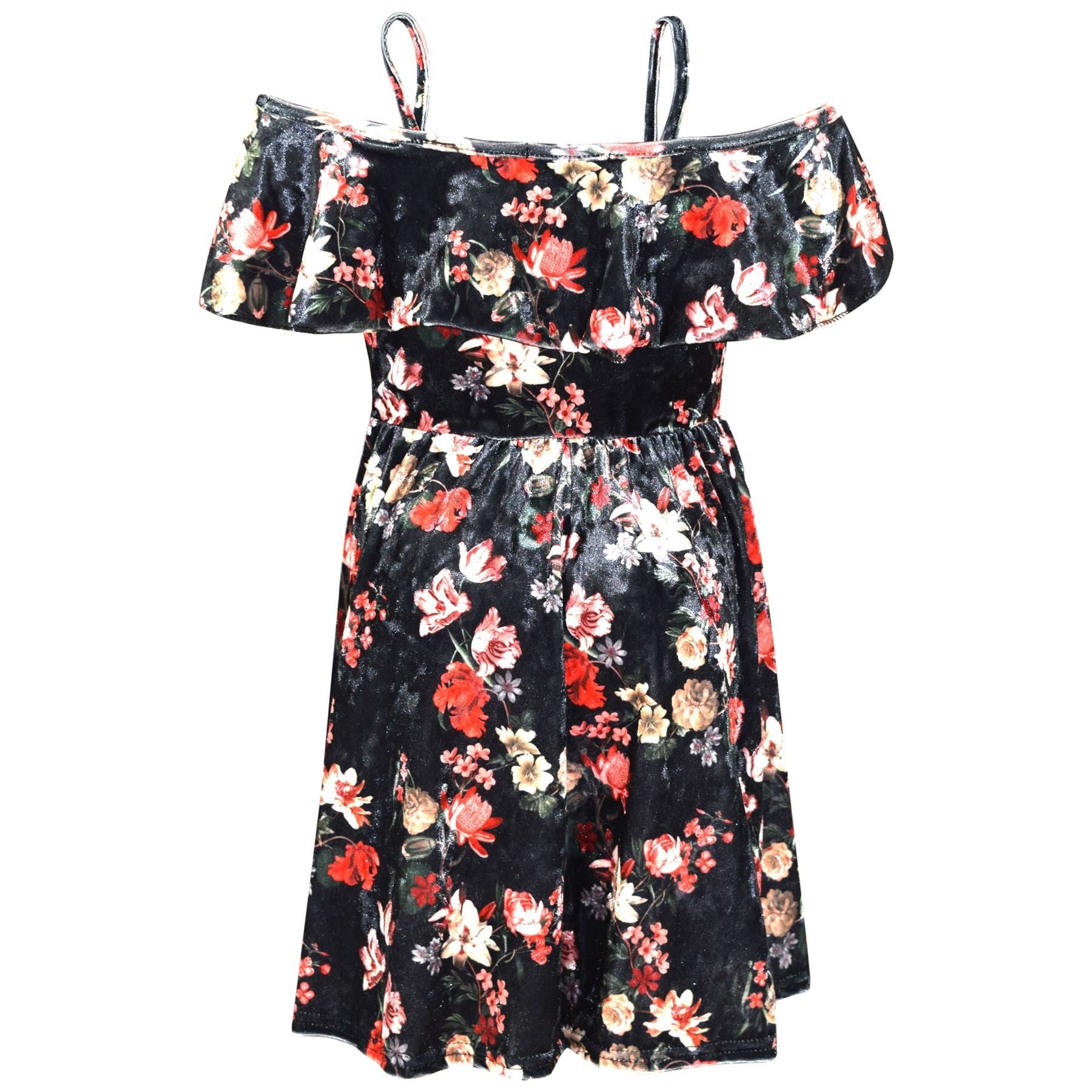 Kids Girls Skater Dress Floral Black Style Off Shoulder Dresses Age 7-13 Years