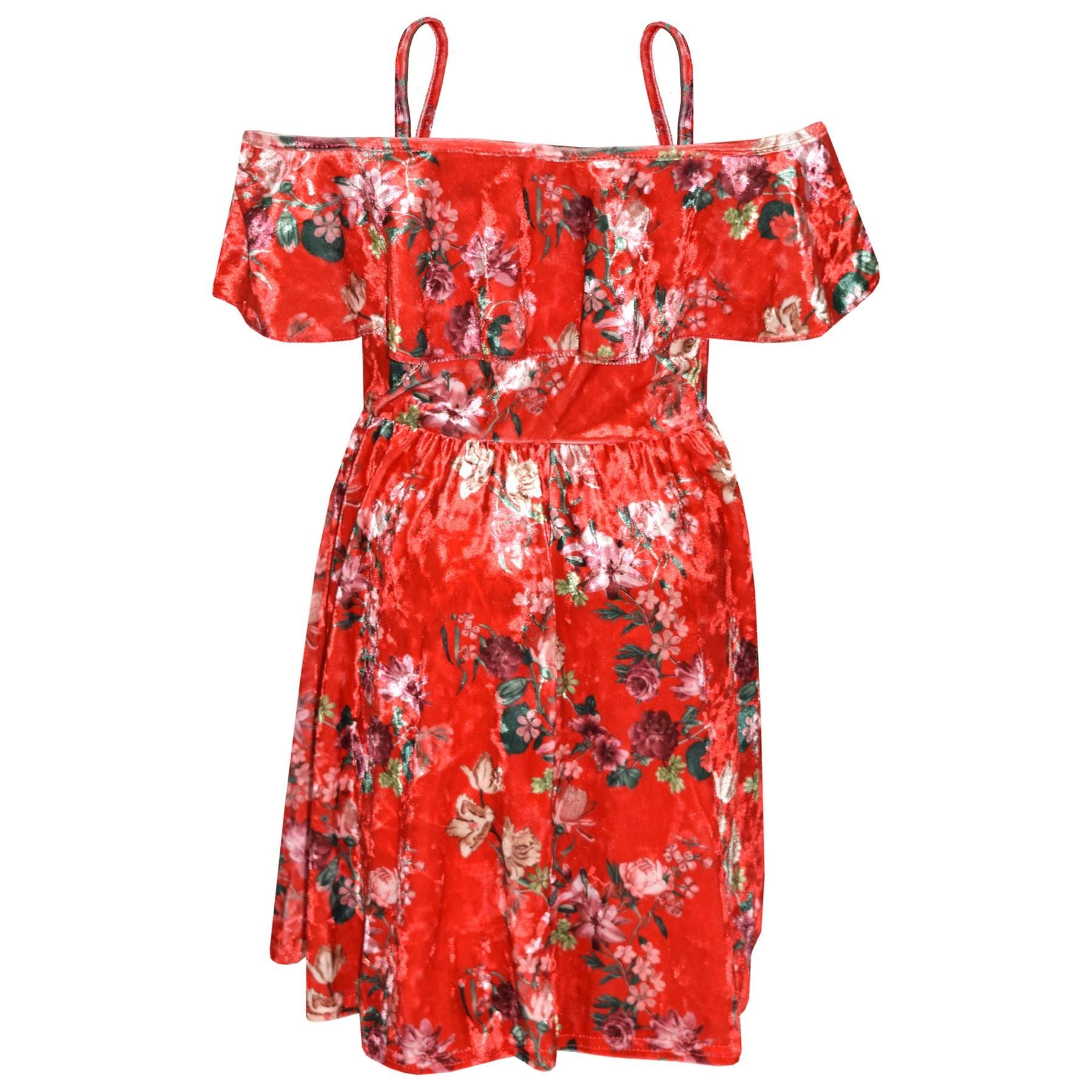 Kids Girls Skater Dress Floral Red Summer Party Off Shoulder Dresses 7-13 Years