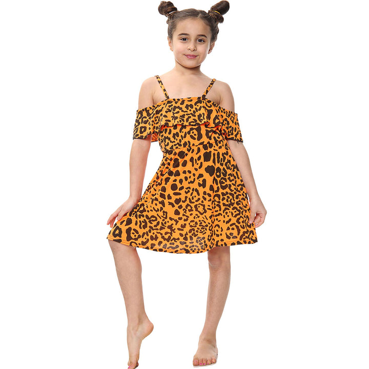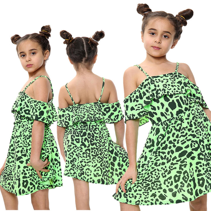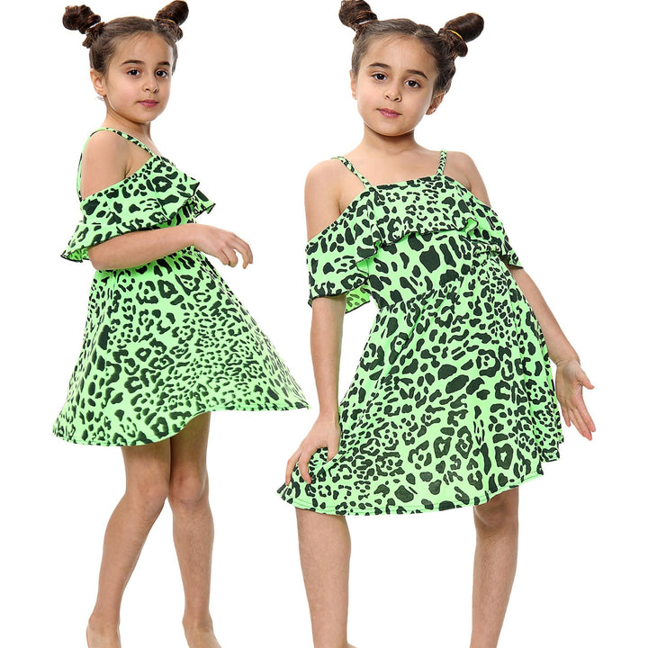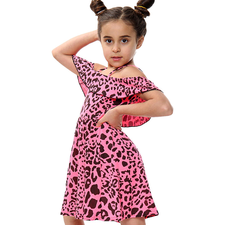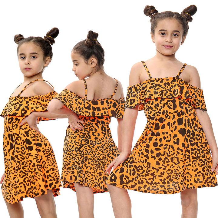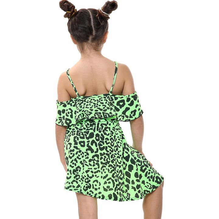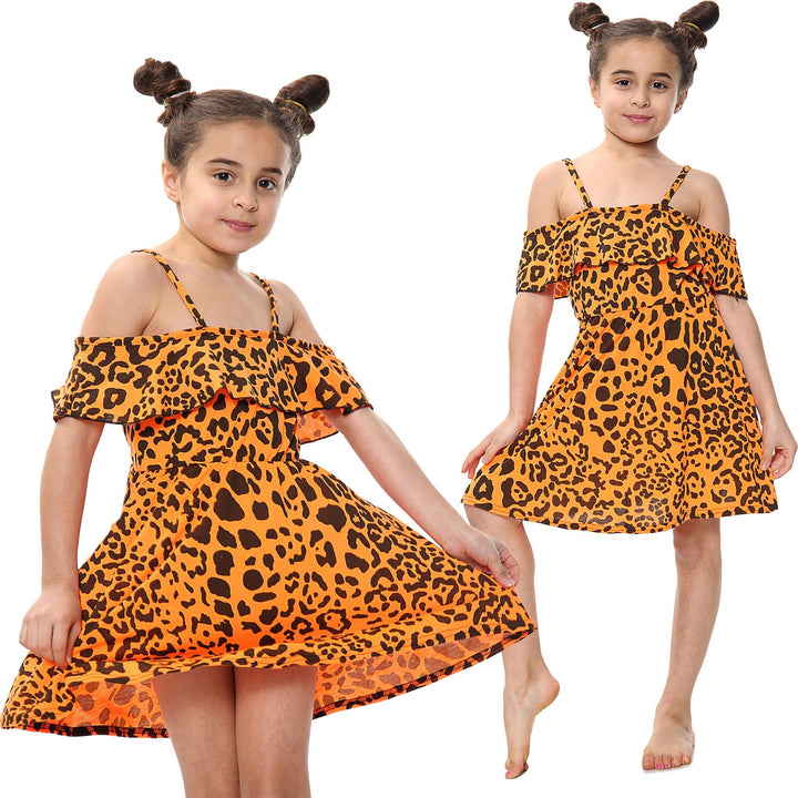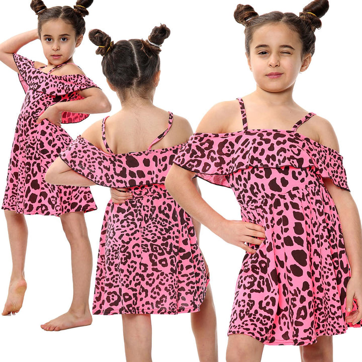 Kids Girls Skater Dress Leopard Print Summer Party Off Shoulder Dress 5-13 Years