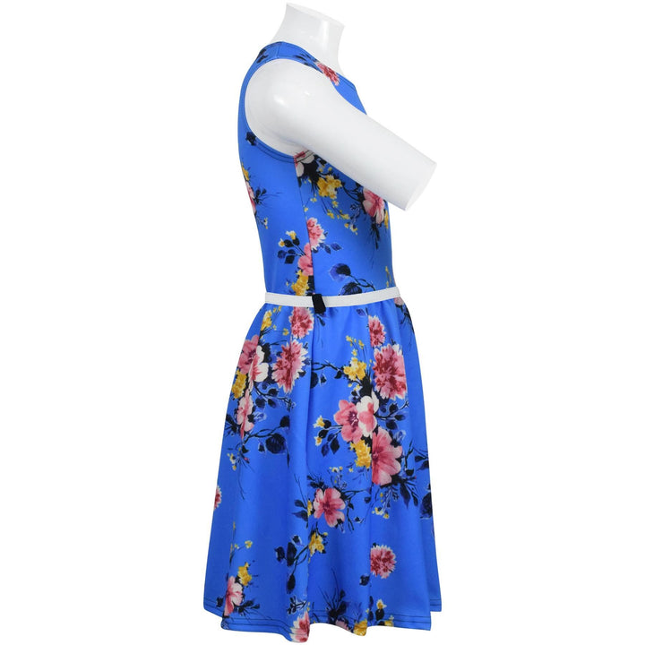 The girls dress is a charming garment with multiple standout features. It epitomises effortless style, featuring adorable sleevesless, a delightful Floral print, a belt for secured fit, a rounded neckline, and a relaxed, casual fit that falls below the knee. Crafted as a pullover design from lightweight fabric, it promises unparalleled comfort for wearers. -