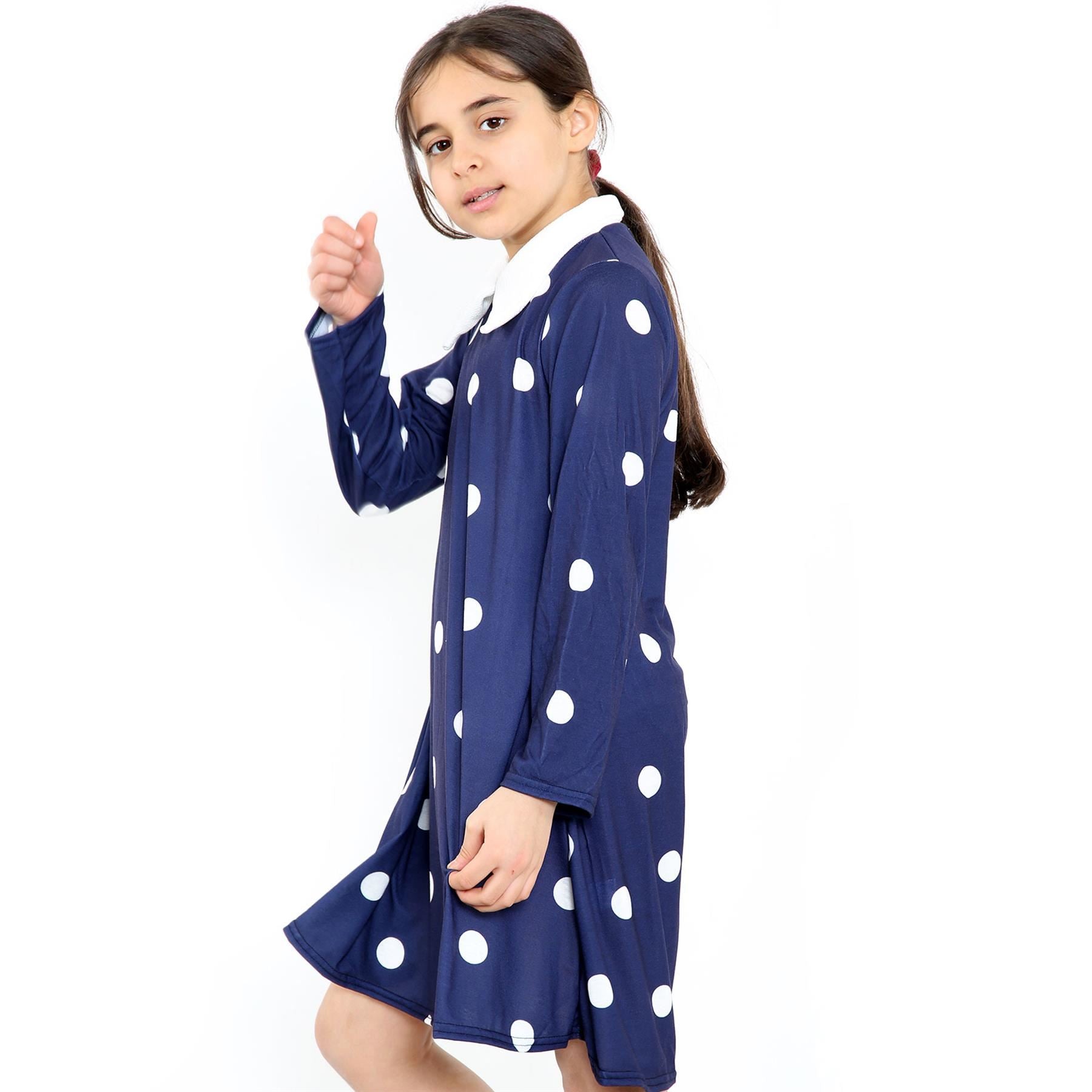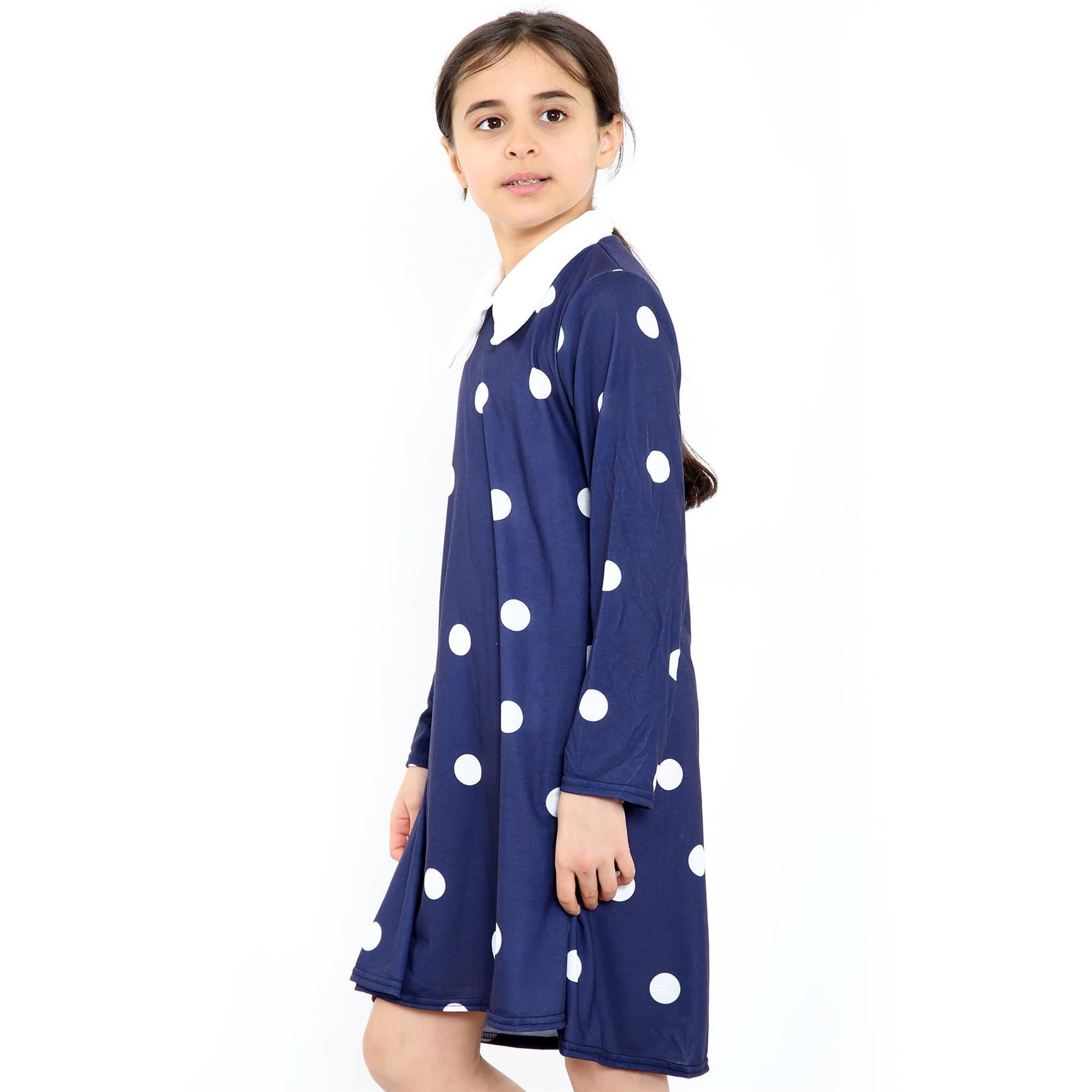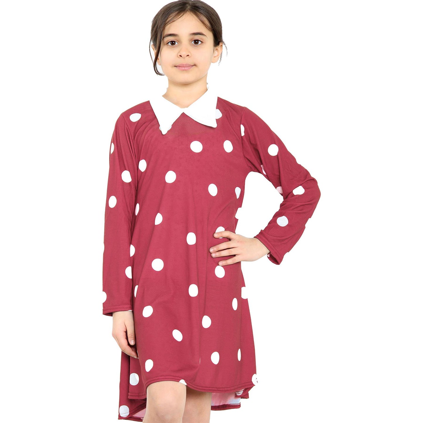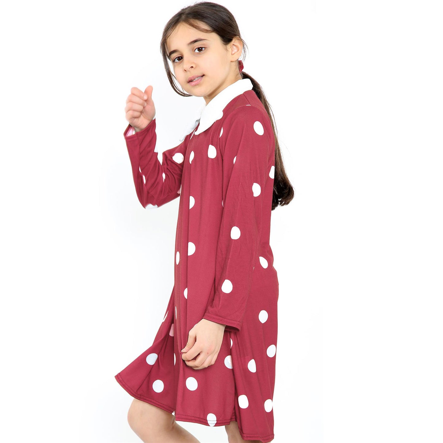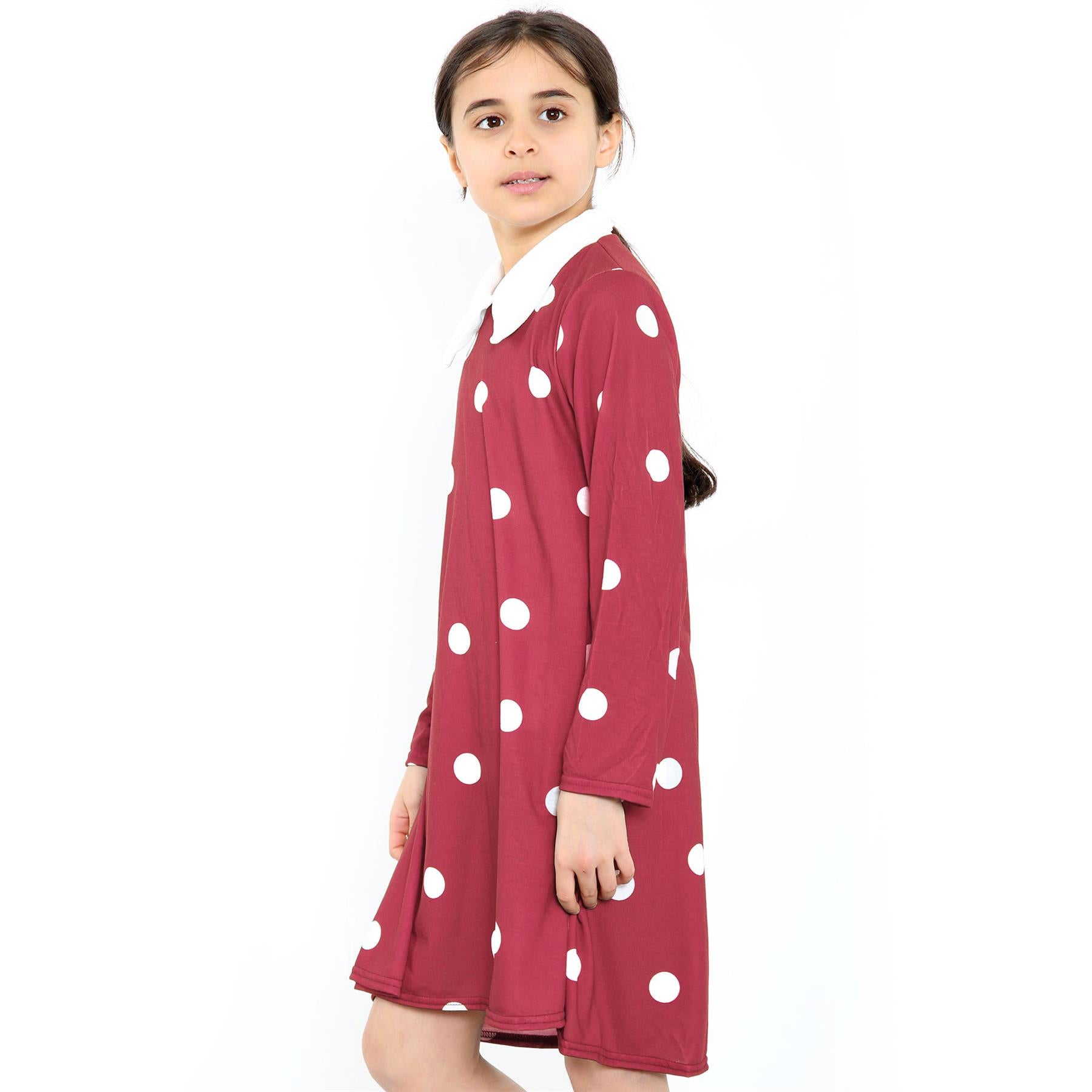 The Girls Dress boasts several attractive features, including a Peter Pan collared neckline, elegant long sleeves, an A-line flared design, a plain solid color shade, knee-length, a pullover design, lightweight Jersey fabric, and exceptional comfort.