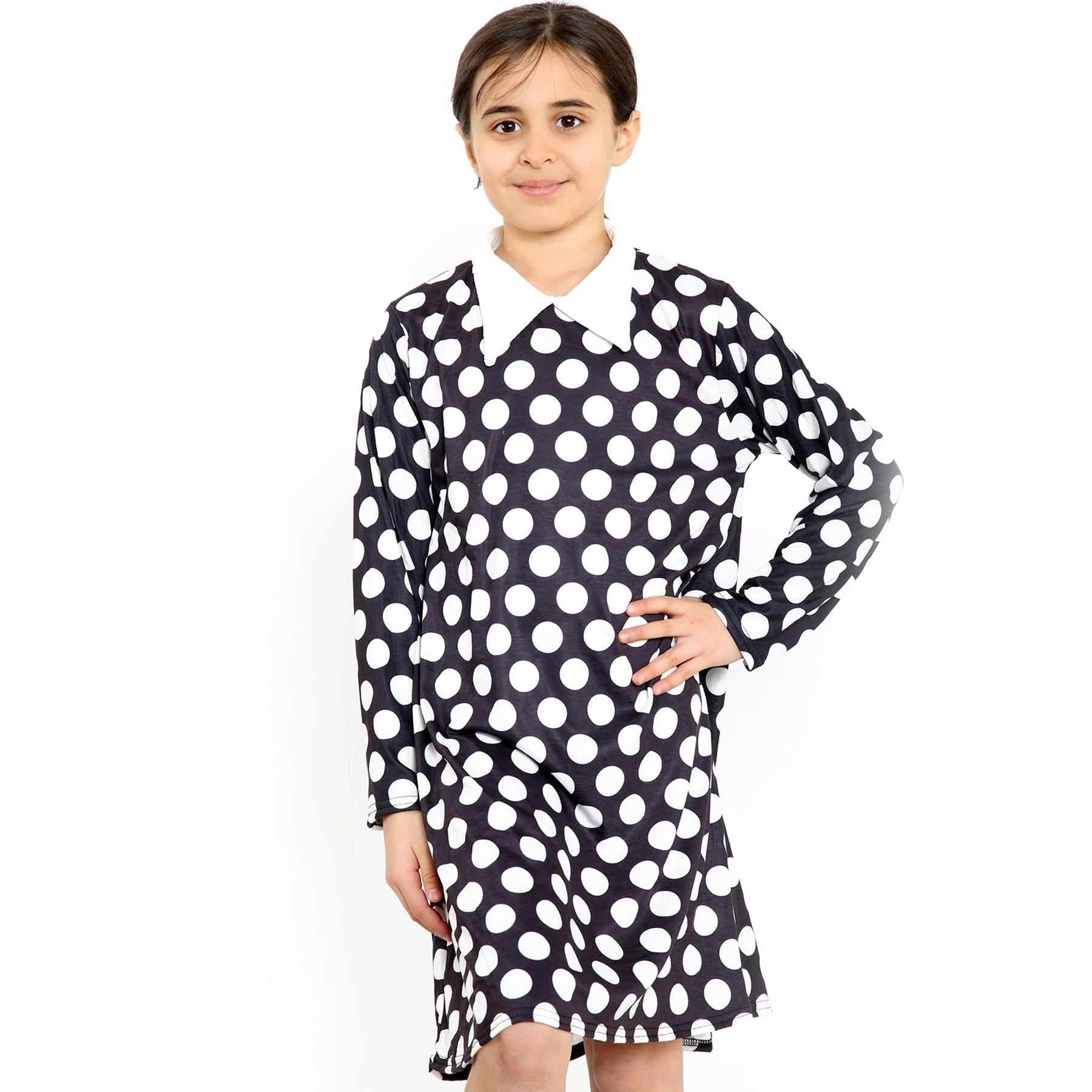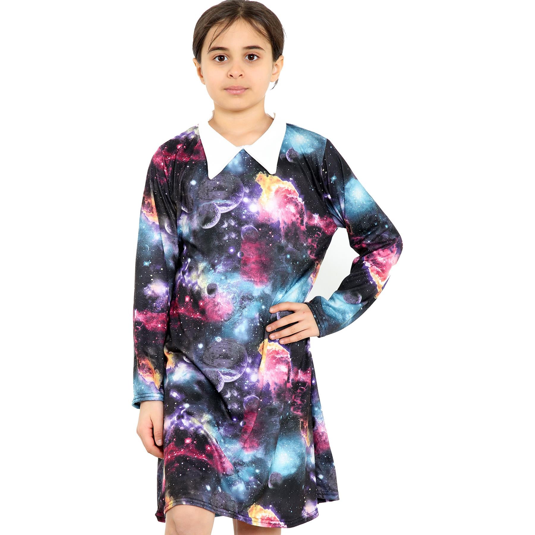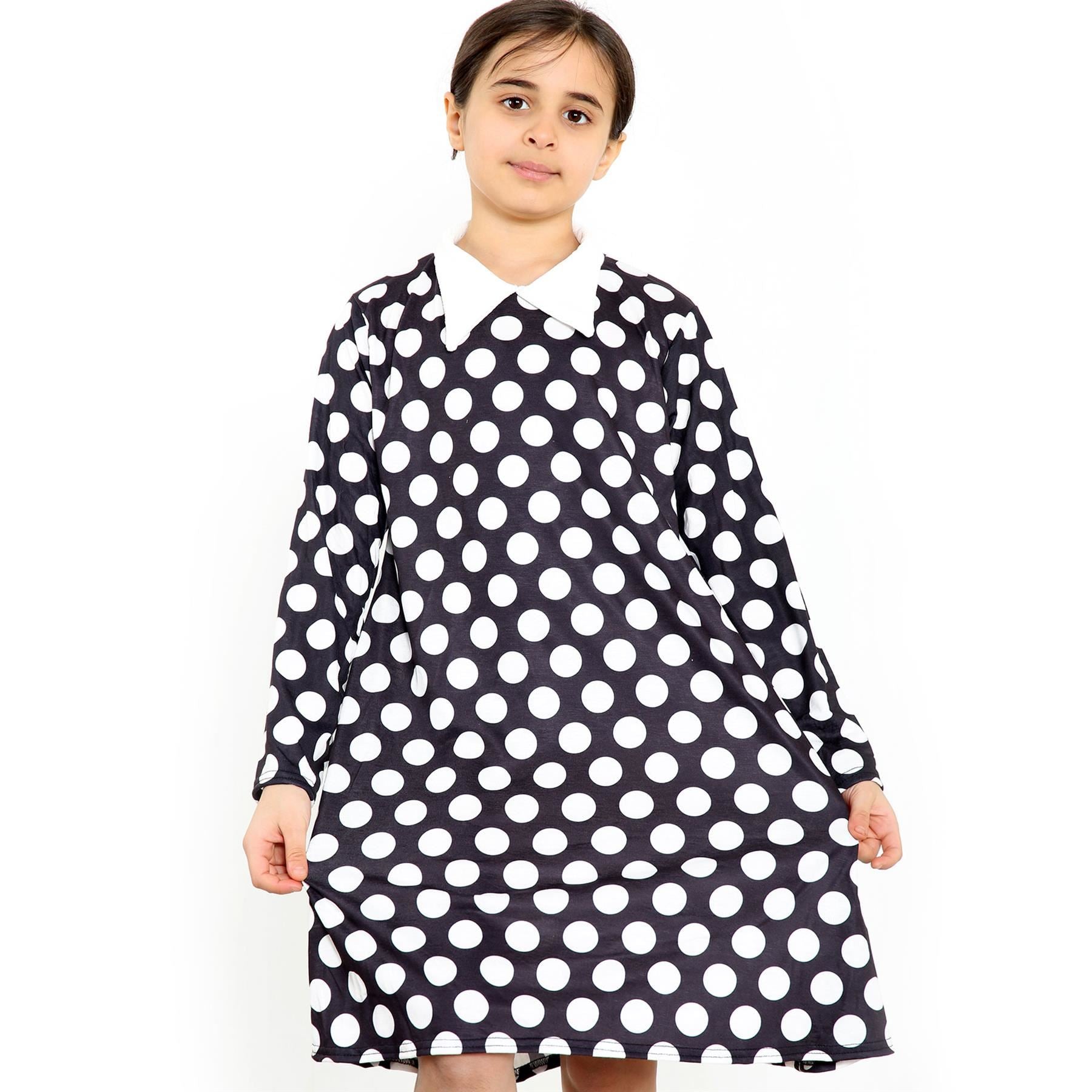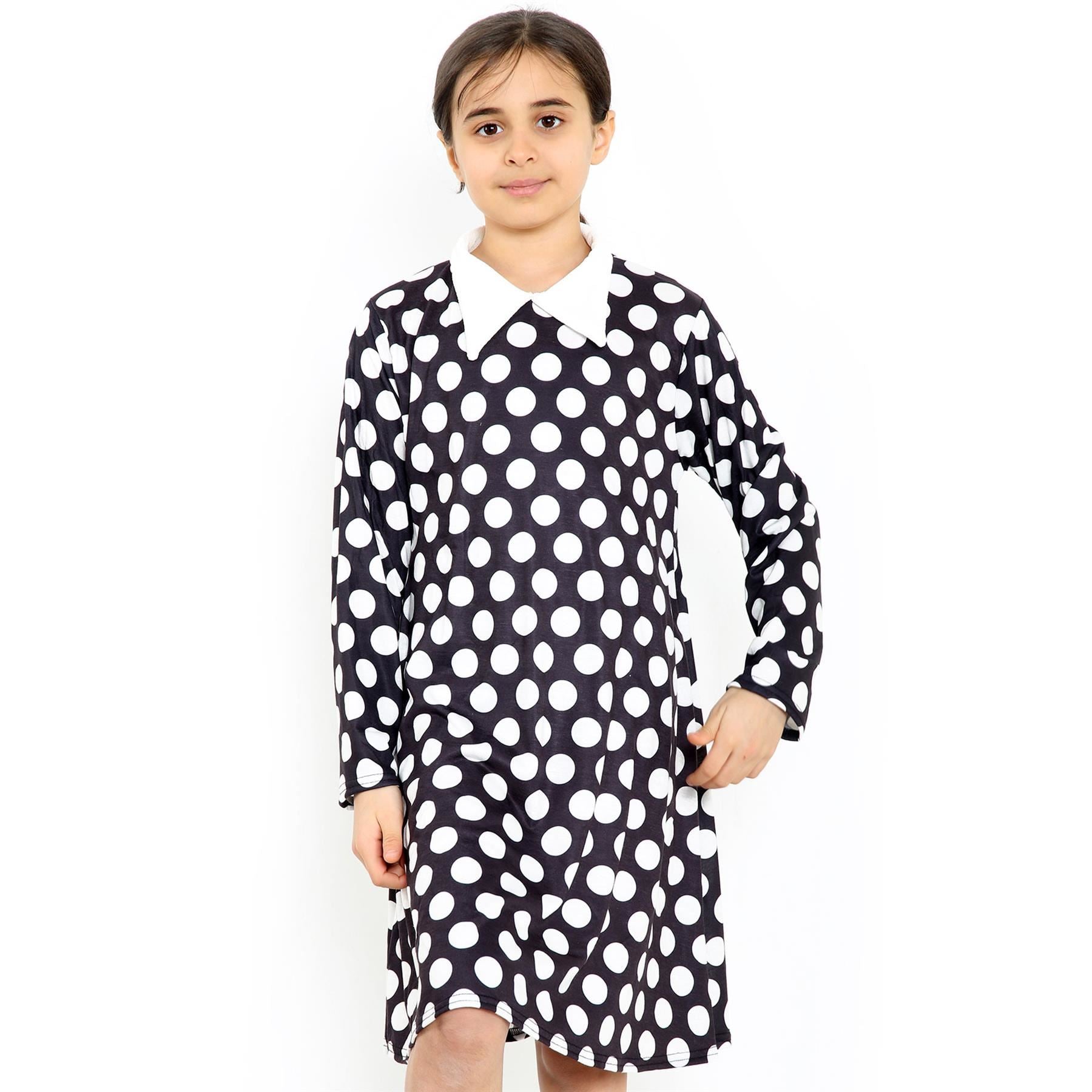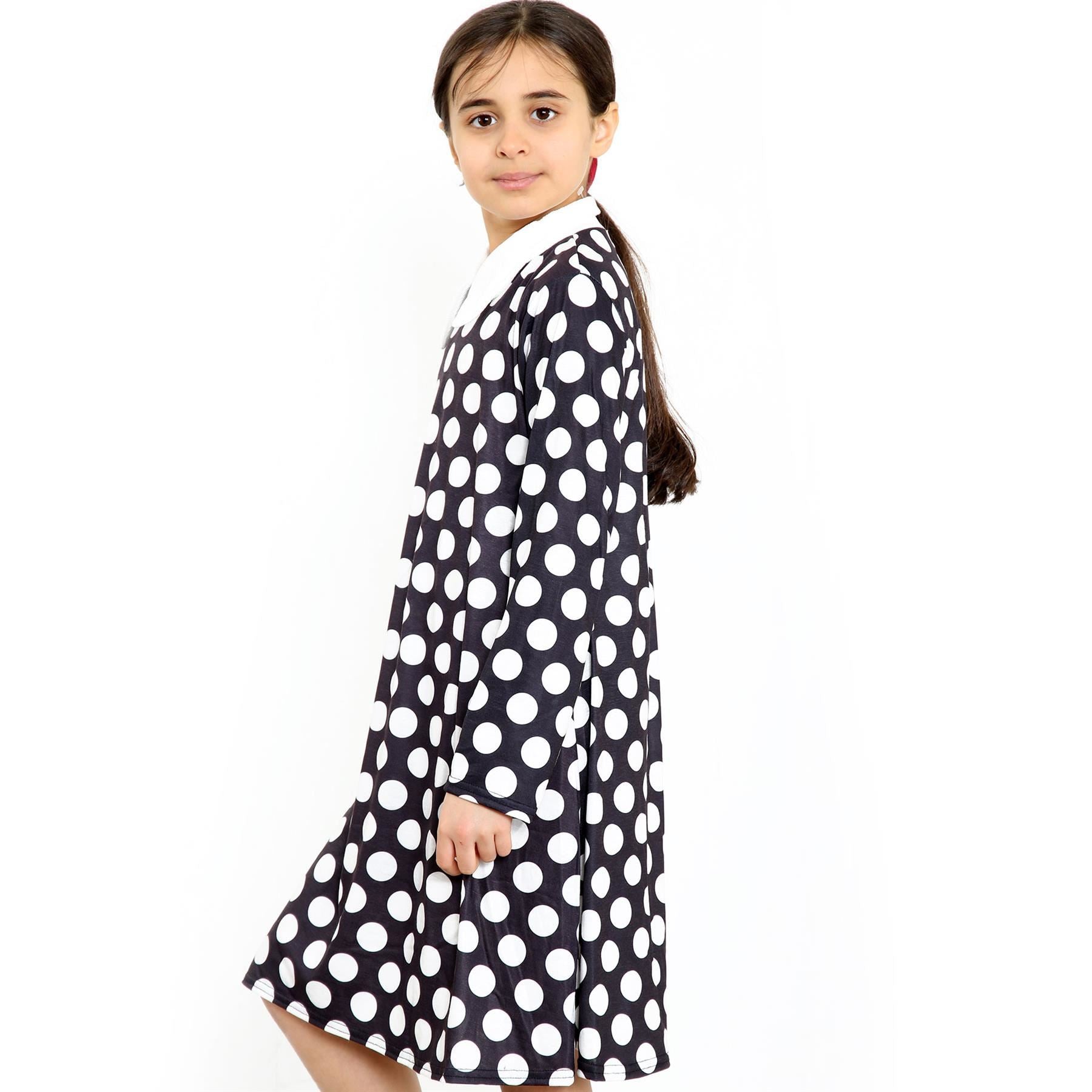 The Girls Dress boasts several attractive features, including a Peter Pan collared neckline, elegant long sleeves, an A-line flared design, a plain solid color shade, knee-length, a pullover design, lightweight Jersey fabric, and exceptional comfort.