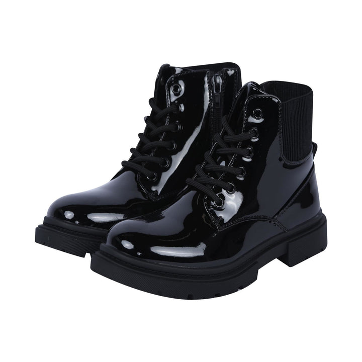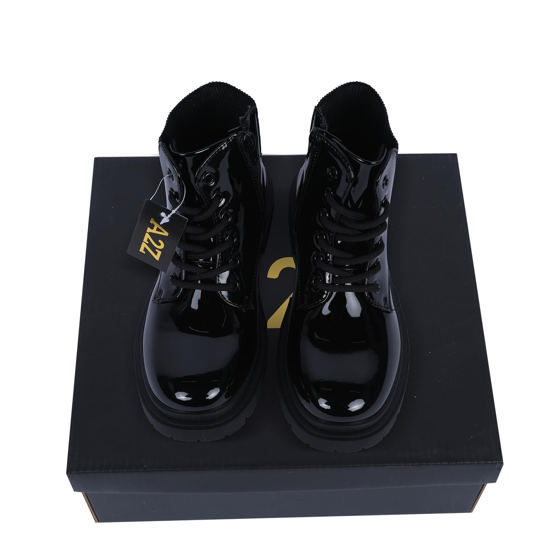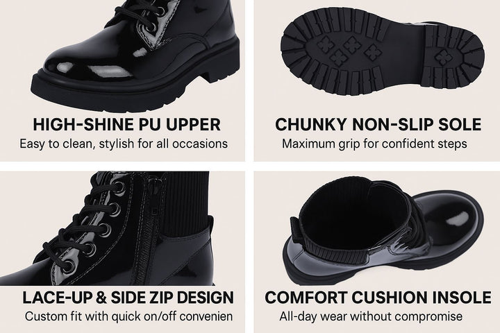 Crafted with a high-shine PU upper, these boots add a sleek, fashionable edge to any outfit while offering easy cleaning and long-lasting wear. Perfect for casual outings, school days, or weekend adventures.