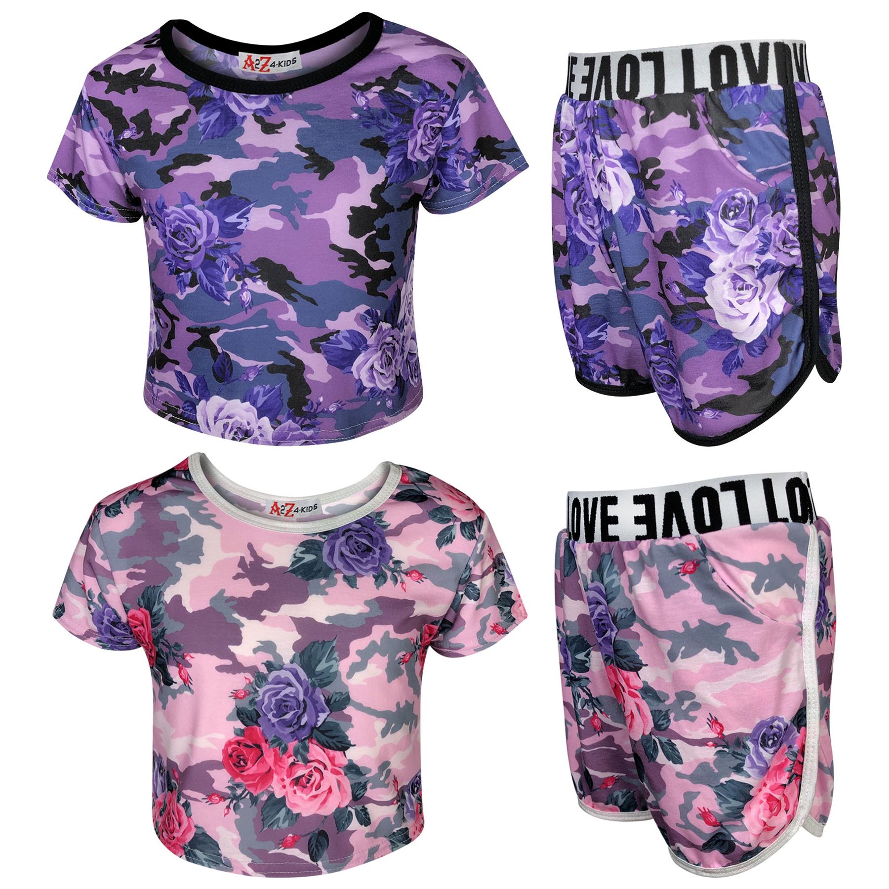 Kids Girls Top & Shorts Camouflage Floral Print Fashion Summer Outfit Set 7-13 Y