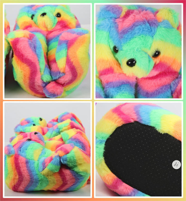 Kids Girls Womens 3D Rainbow Bear Slippers Cute Animal Face Soft Plush Warm Shoe