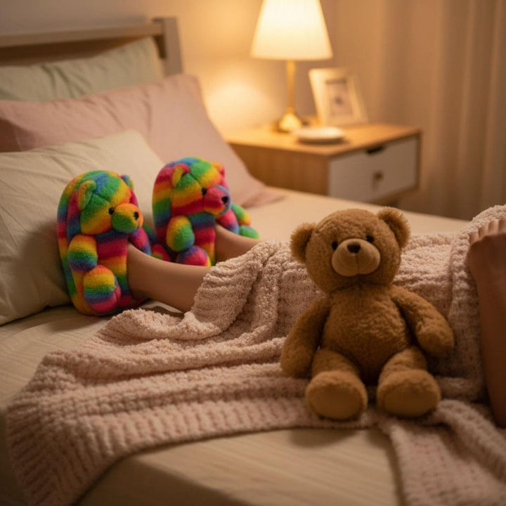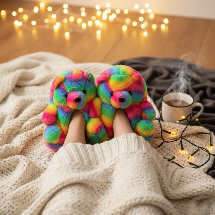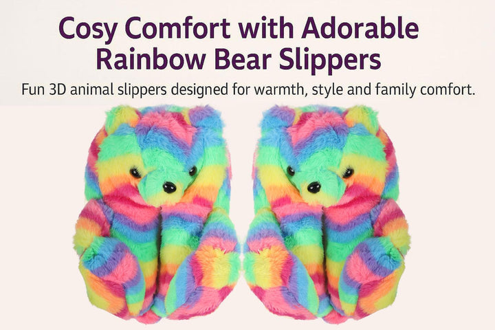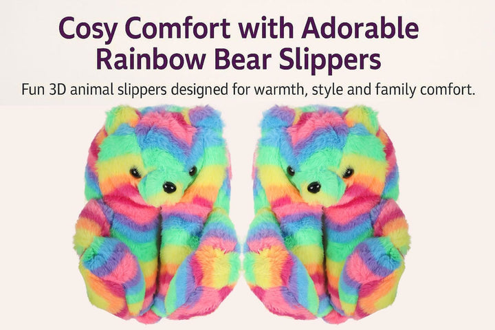Fun rainbow coloured bear slippers with a detailed 3D face and plush ears bring joy to every step. Perfect for adding a playful touch at home, lounging, or sleepovers, these slippers brighten up your day while keeping feet snug, making them an ideal gift for kids and women who love cute animal designs.