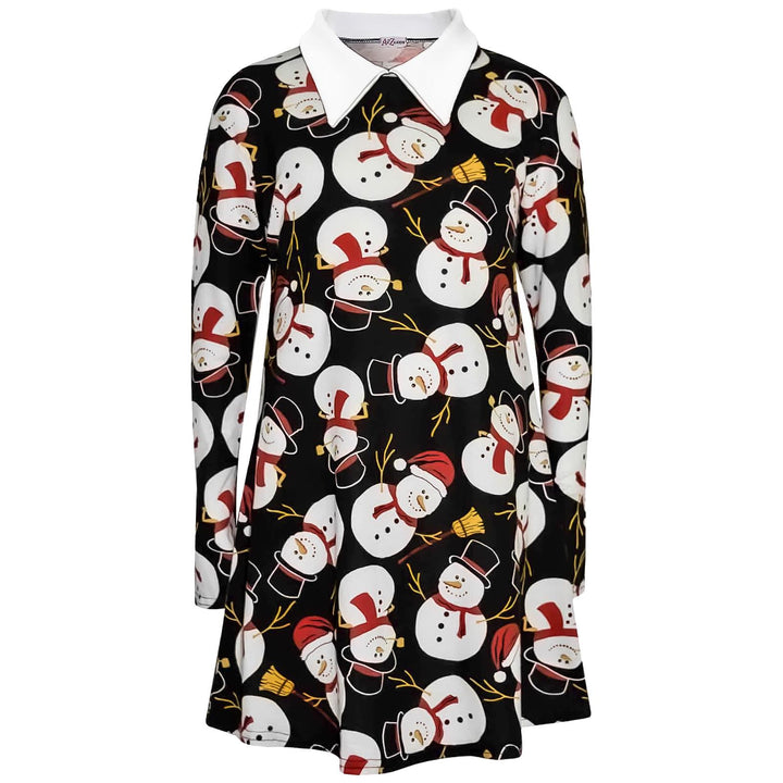 Available in sizes tailored for girls aged 5 to 13, ensuring a perfect fit for every child. Choose between two delightful designs: the Black Santa dress with a jolly Santa motif or the Black Snowman dress showcasing cheerful snowman prints. Both options offer a festive and stylish look for the season. -